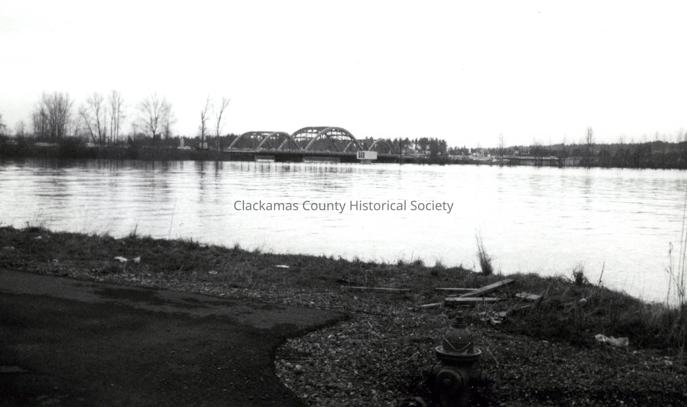 Flood, December 27,1964, McLoughlin Bridge (Highway 99) across the Clackamas River. Photo taken from shopping center. The structure near the bridge is the abandoned City of Gladstone water intake facility. It on the Oregon City side of the river.Made/Created