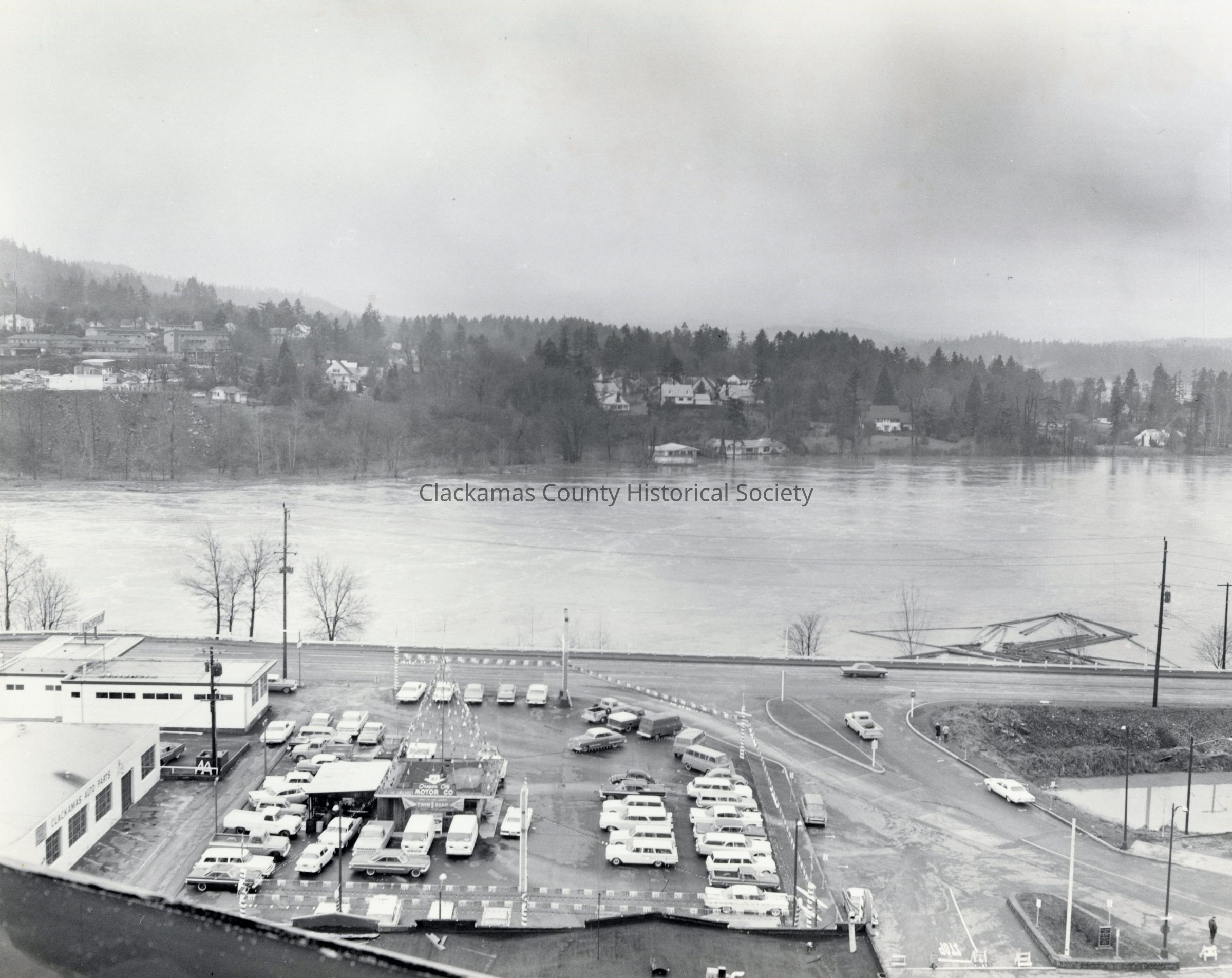 Flood of 1964. Two Views: See P-1596 Looking north showing Busch Furniture prior to current location and P-5234 looking to West Linn from Oregon City.
