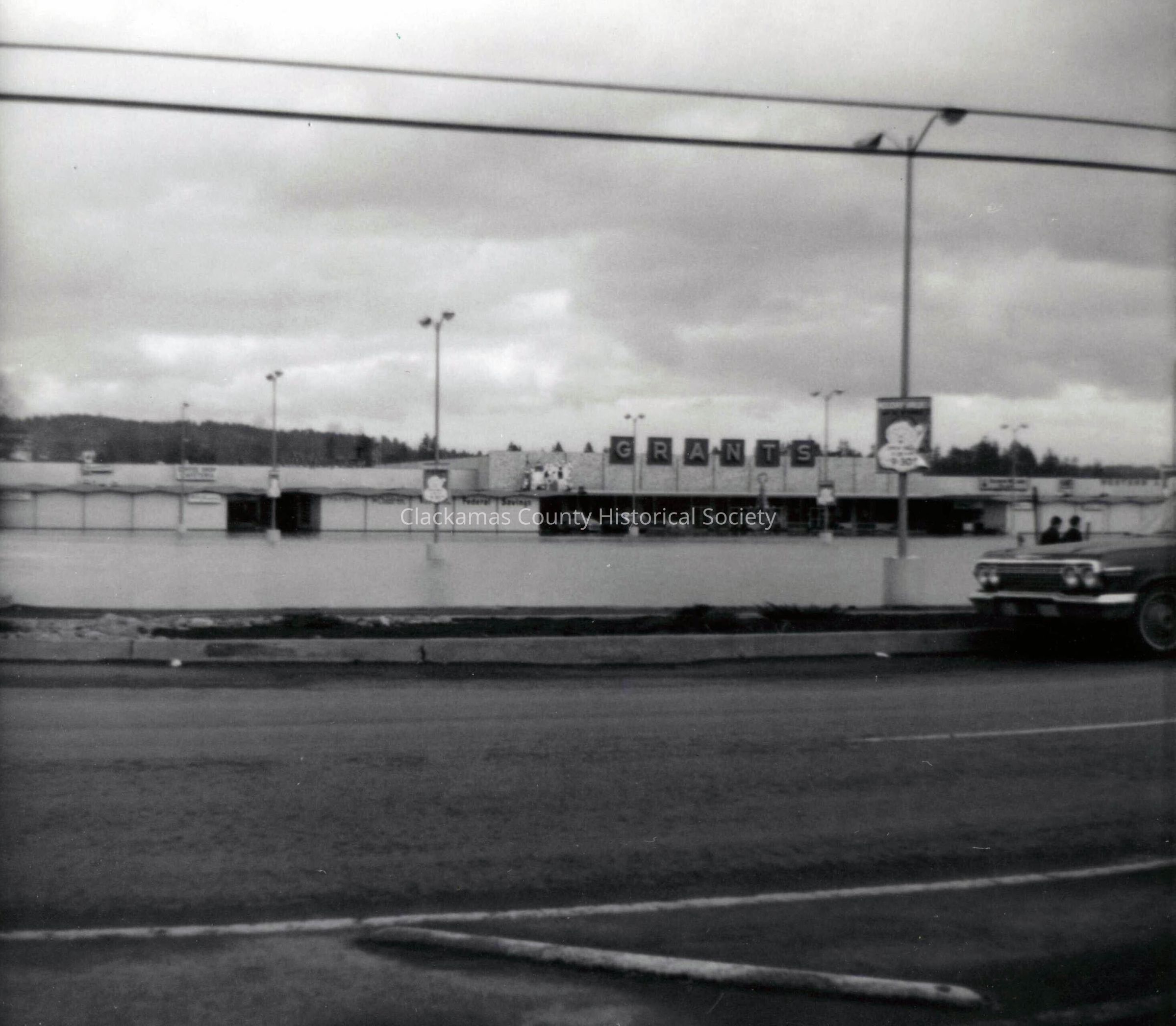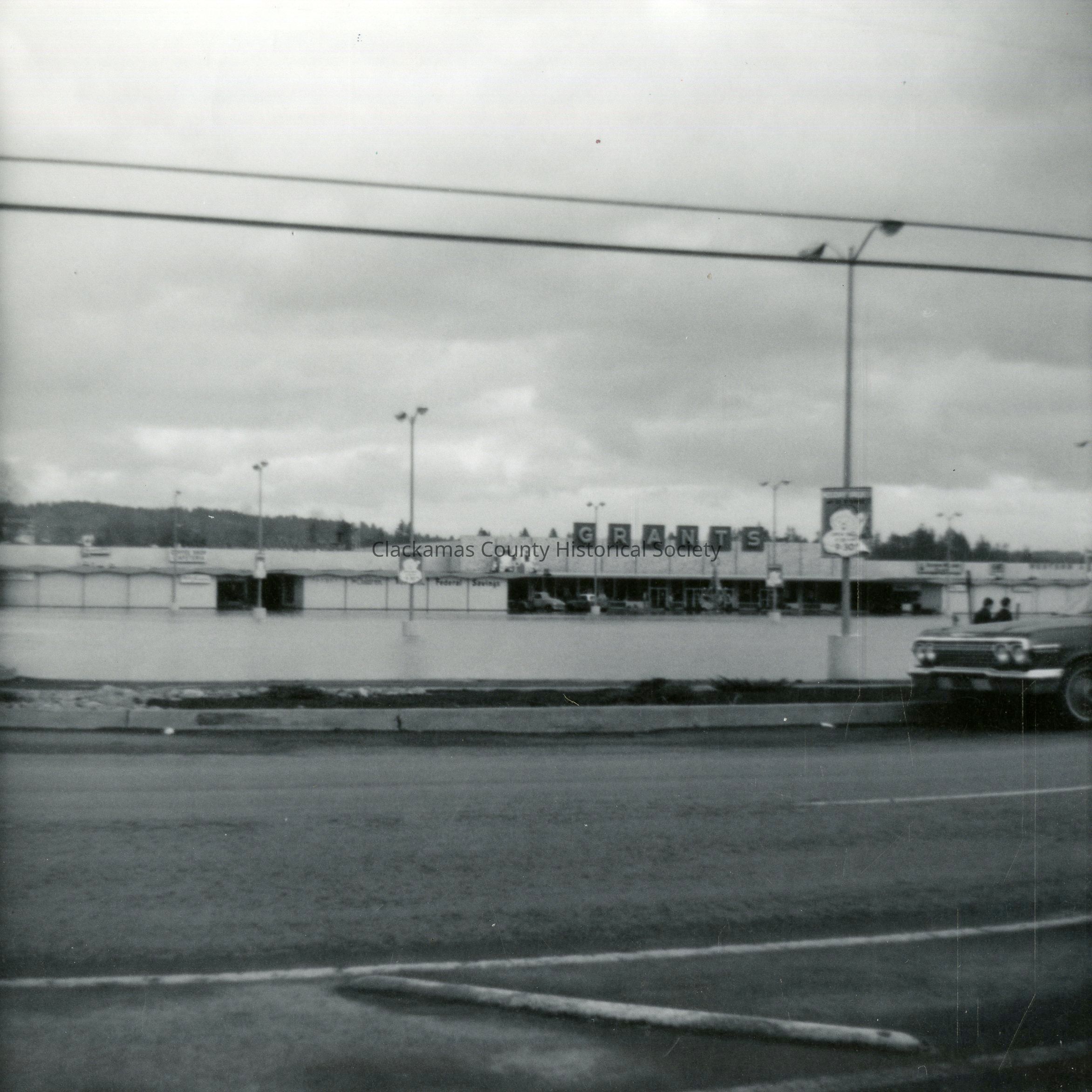 1964 Flood. Oregon City Shopping Center. Exterior of buildig from roadway.Made/Created