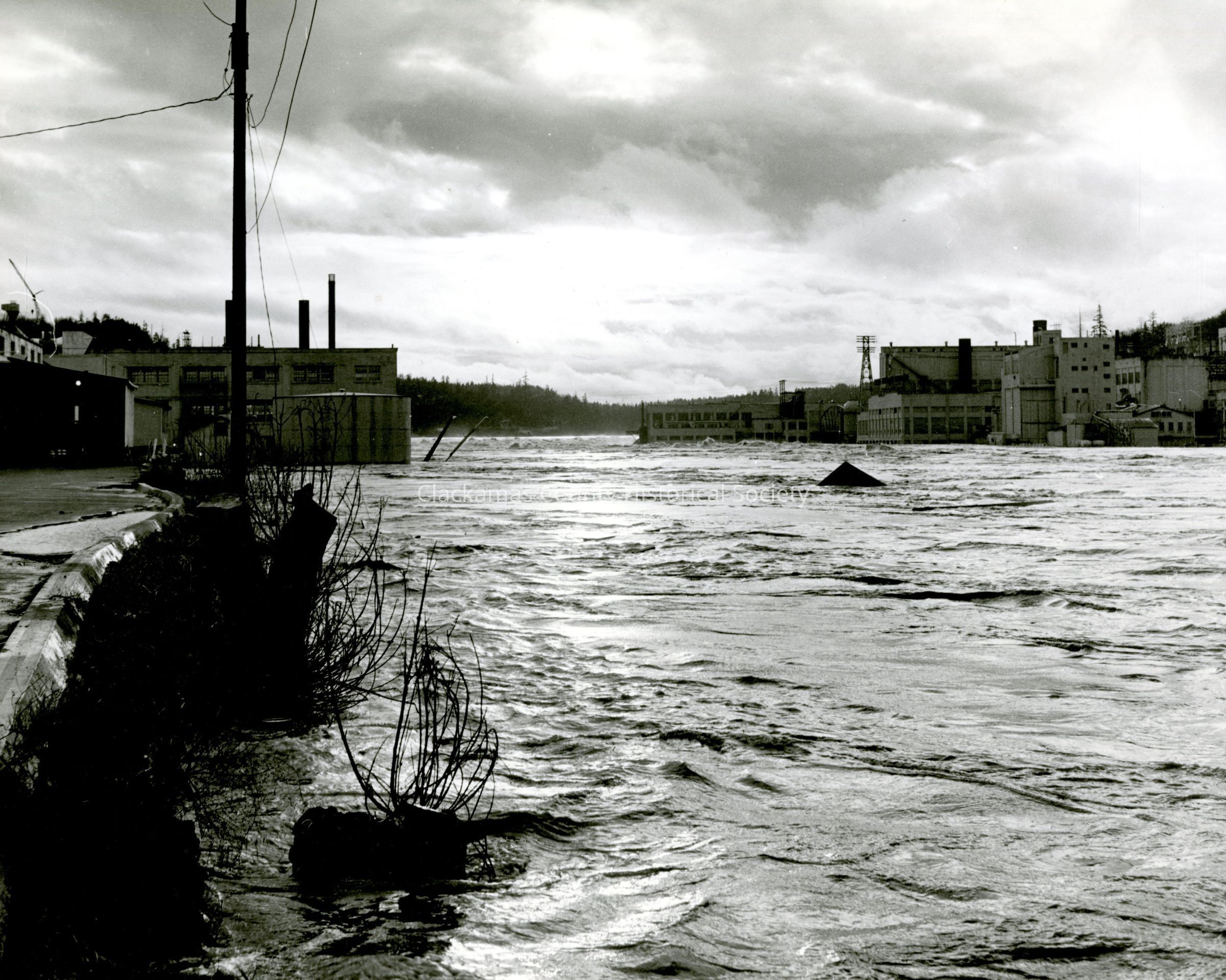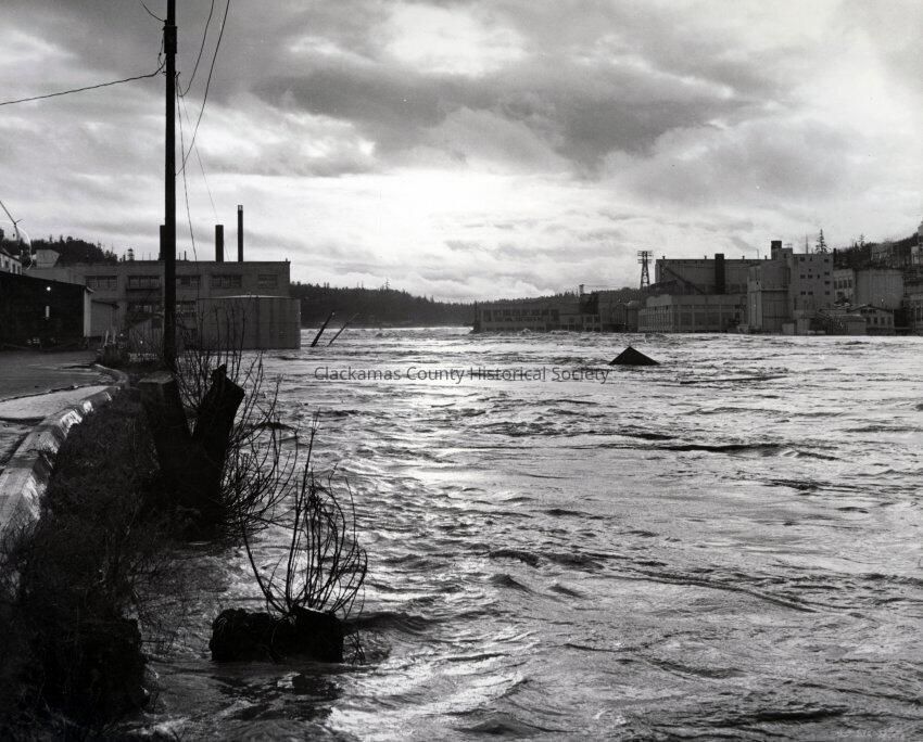 Flood of 1964. View from river level of Mills in Oregon City and West Linn looking up the