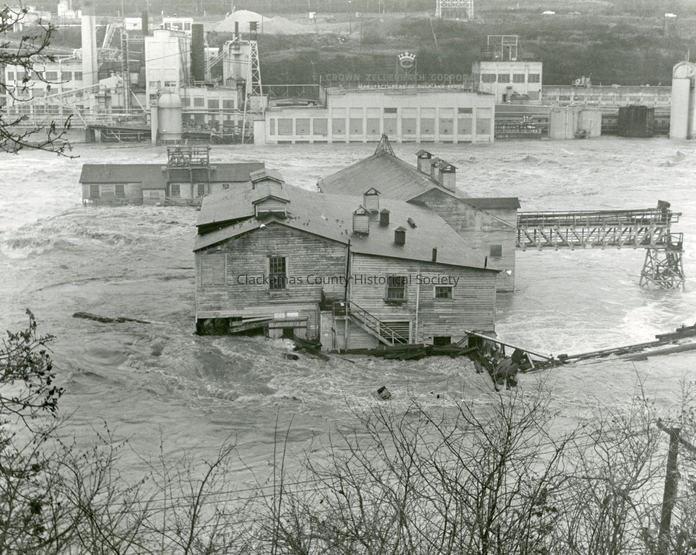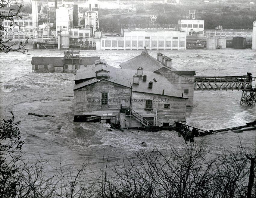 Willamette River flood, 25 Dec 1964. Photo from Oregon City side of Willamette River. Crown Zellerbach pulp and paper on West Linn side.