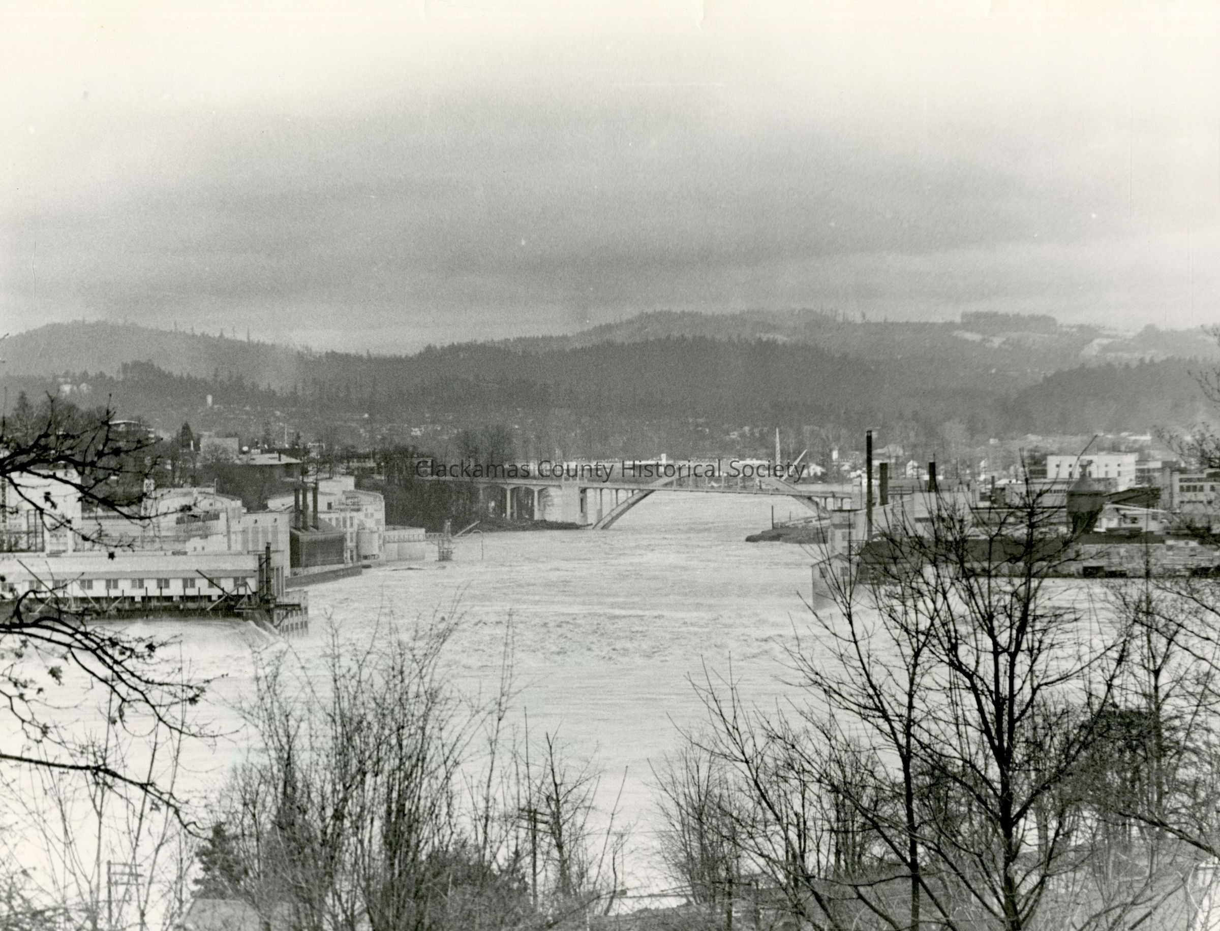 Willamette River flood, 24 Dec 1964. Photo from Canemah looking north showing Willamette River, West Linn mills, Arch Bridge, and Oregon City mills.