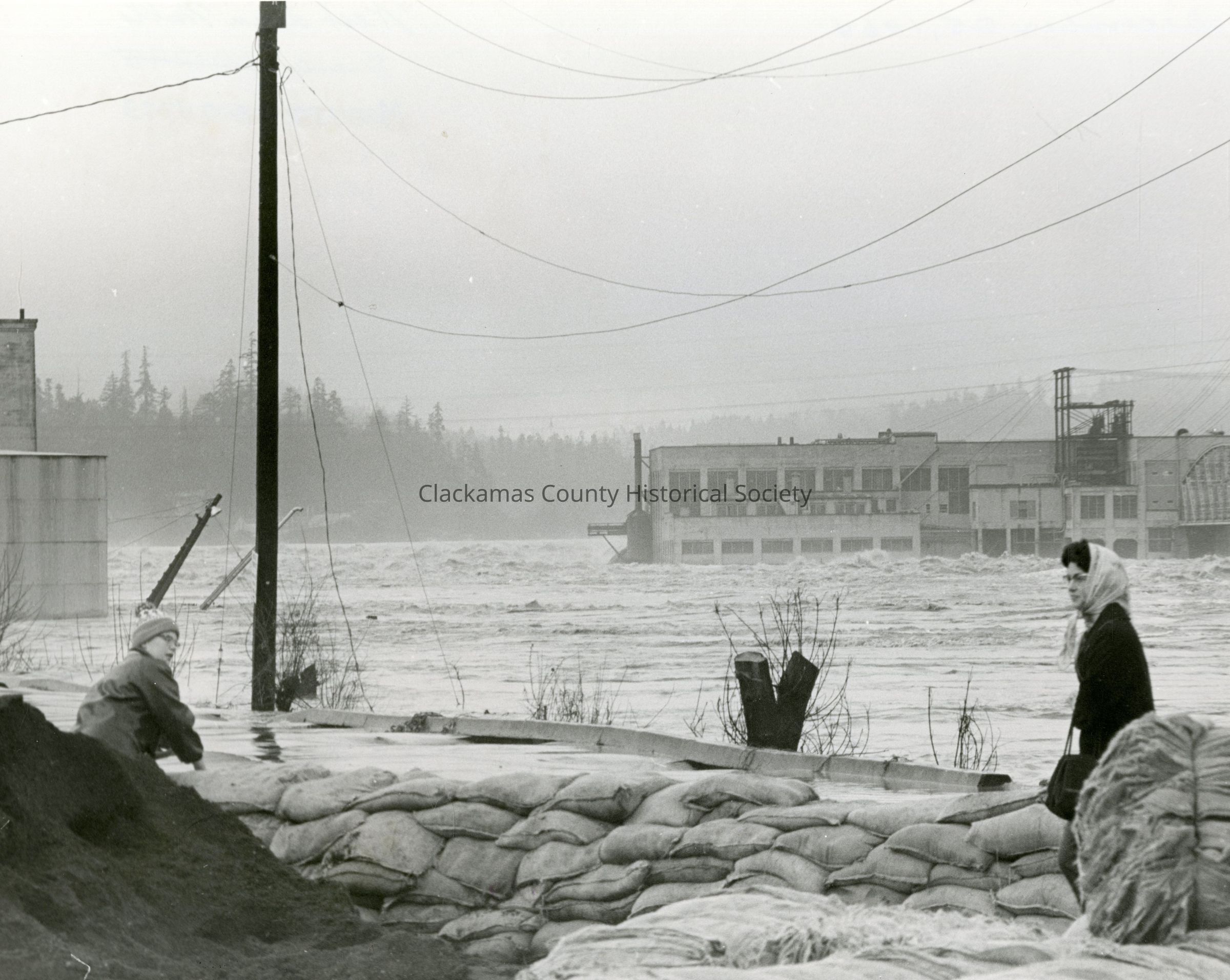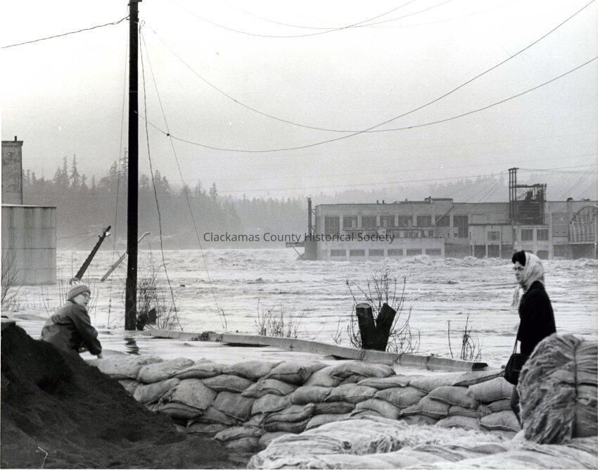 Willamette River flood, 25 Dec 1964. West Linn mills, child and woman in photo.Made/Created