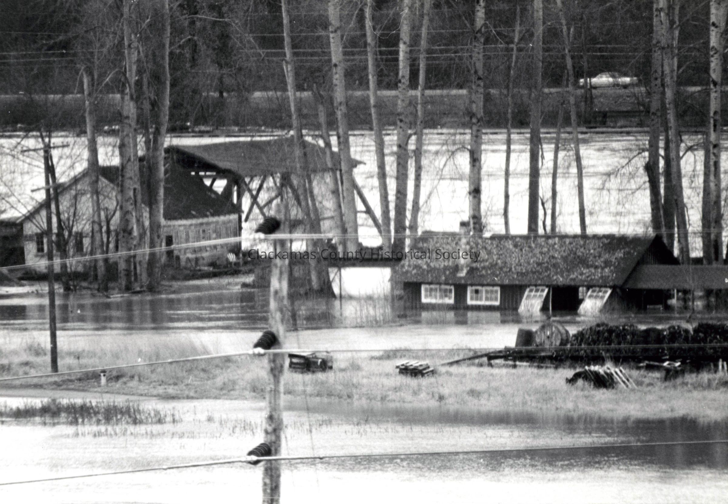 1964-1965 Flood. Willamette tug boat buildings, Oregon City.
