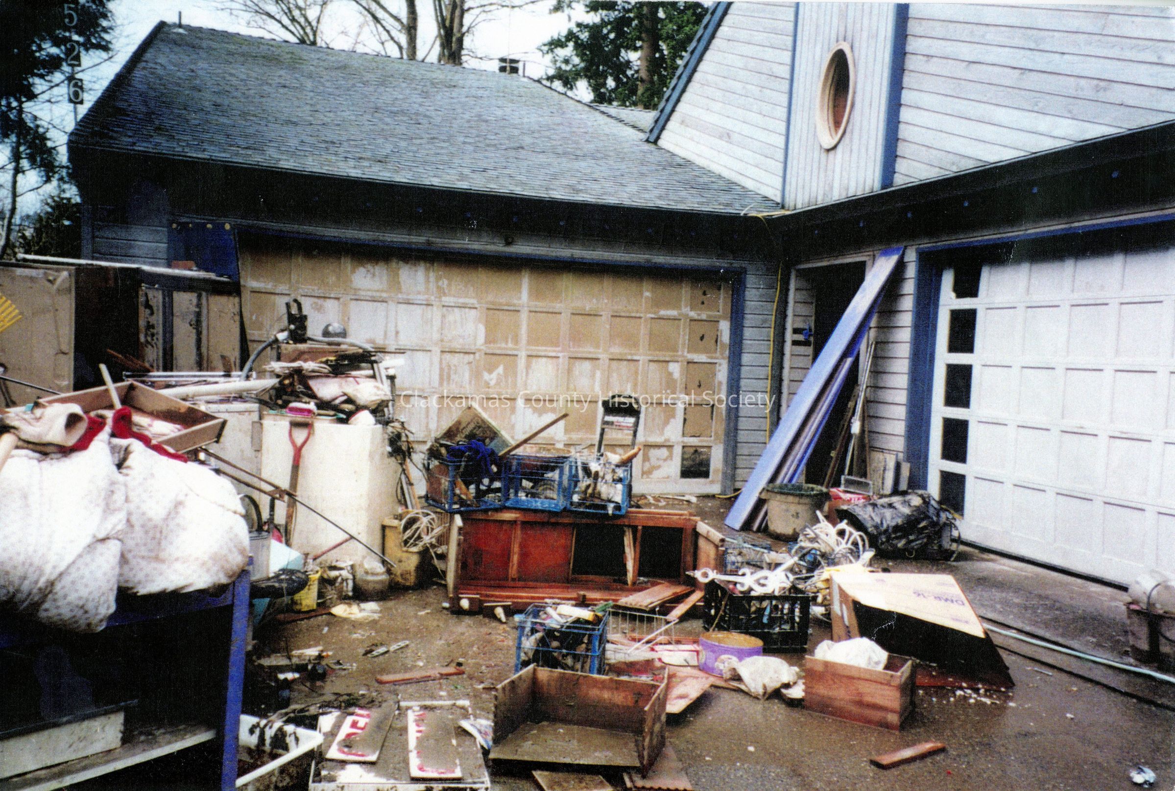 Flood of 1996, Lancaster House on Willamette River. Flood debris.