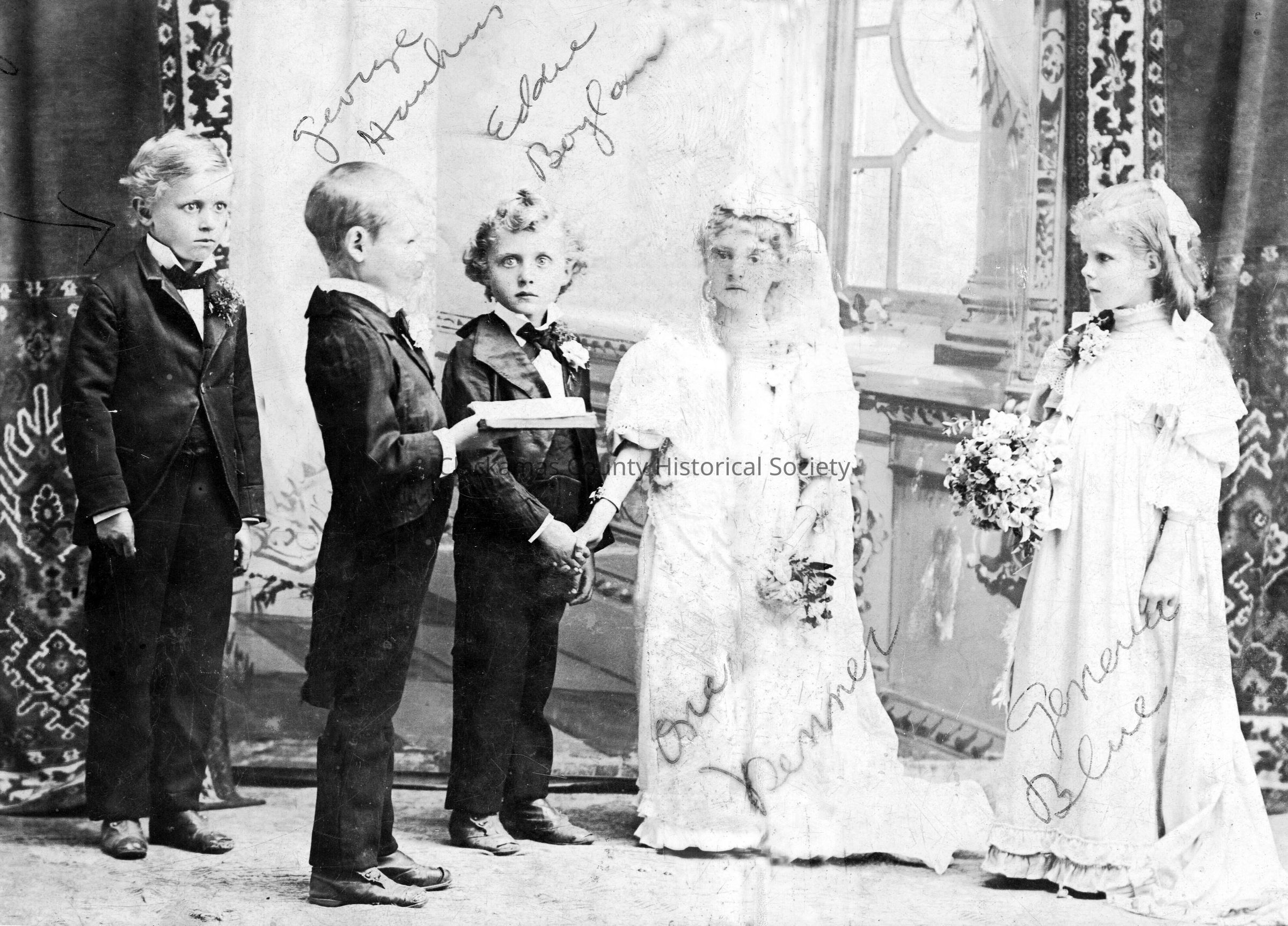L-R: Bert Boylan, George Hankins, Eddie Boylan, Ona Renner and Genevie Blue. Children play acting a WeddingMade/Created