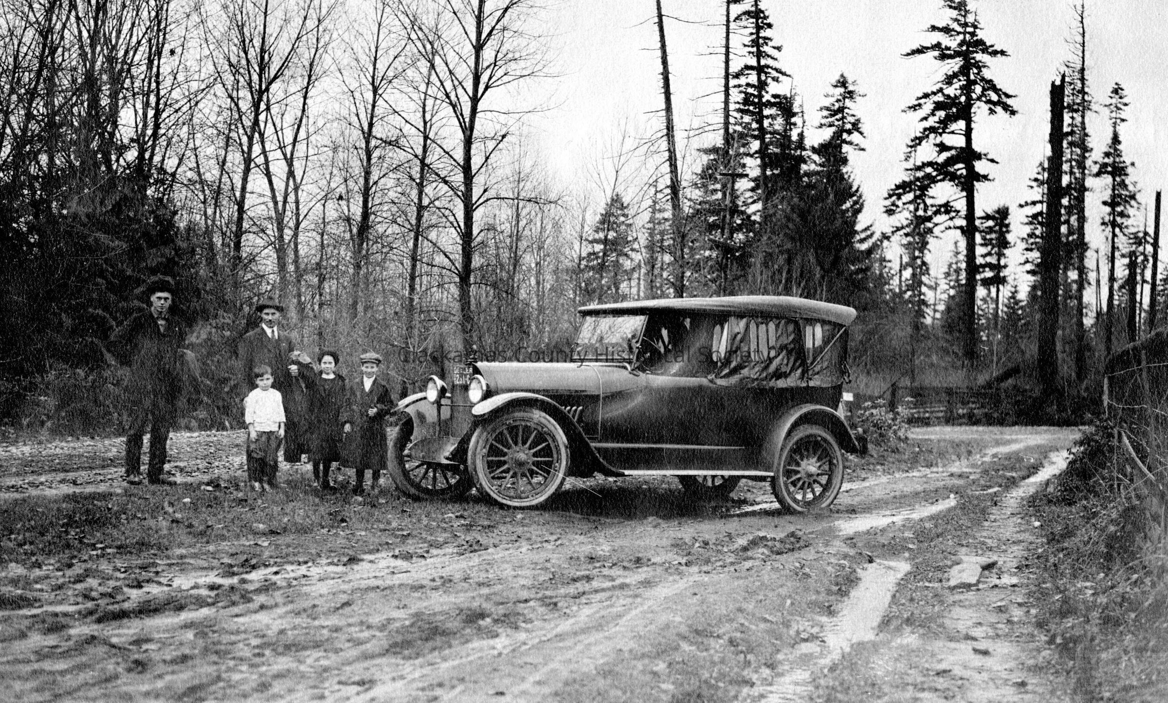 (L-R): Thomas Carrico; Tyron Everhart; Ferd Curran; Bernadine Carrico; and Marvin Curran. Group photo in front of automobile along muddy road.Made/Created