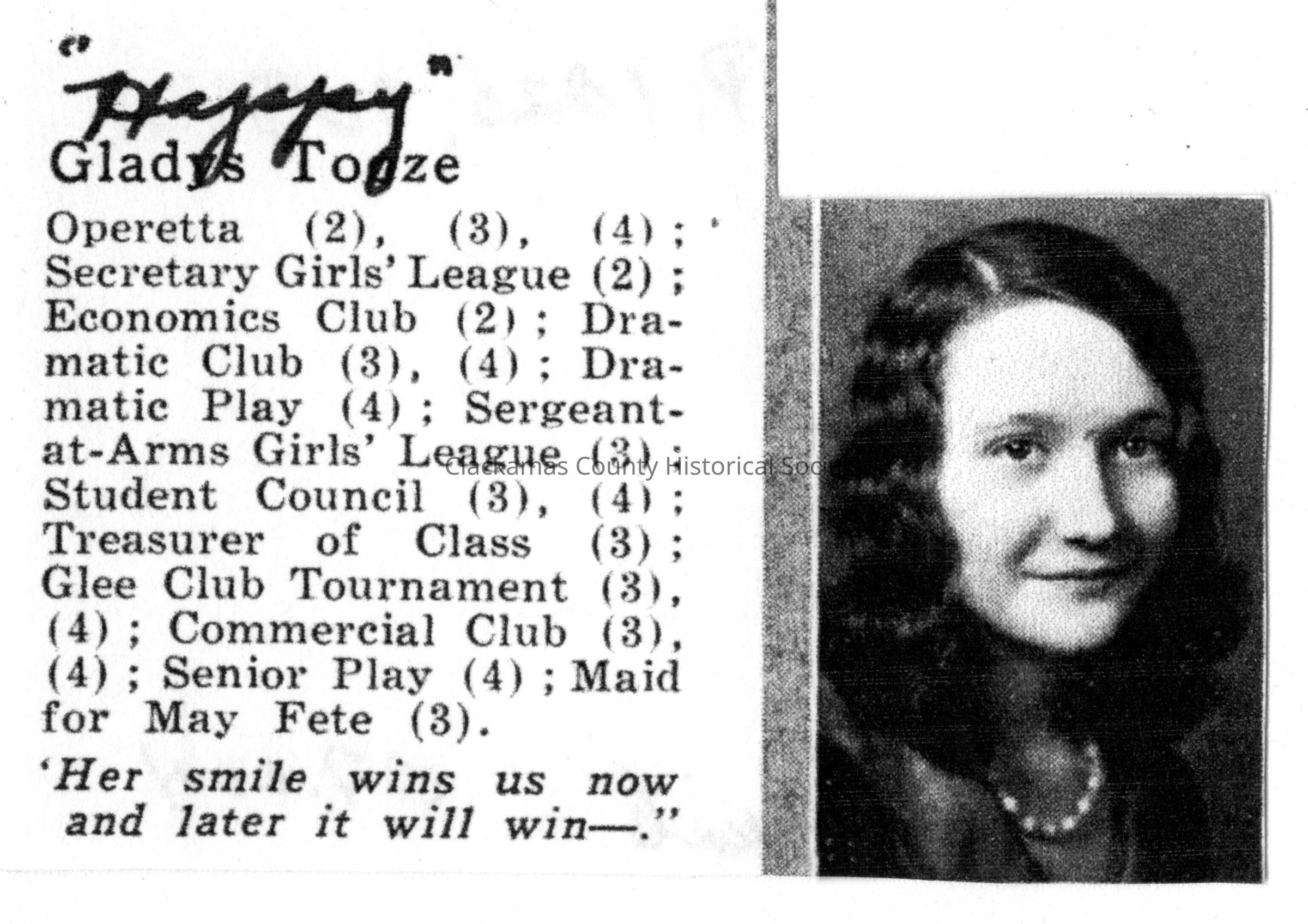 Gladys Tooze. School annual photo with list of particpation.