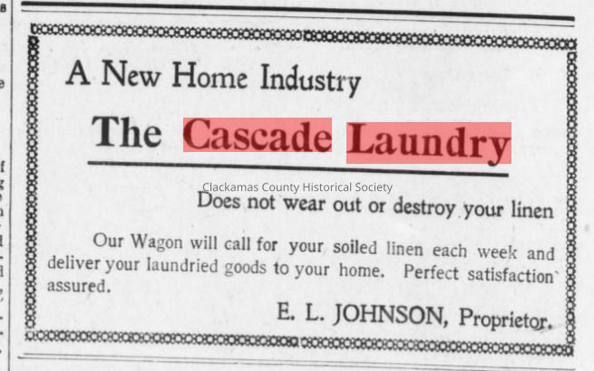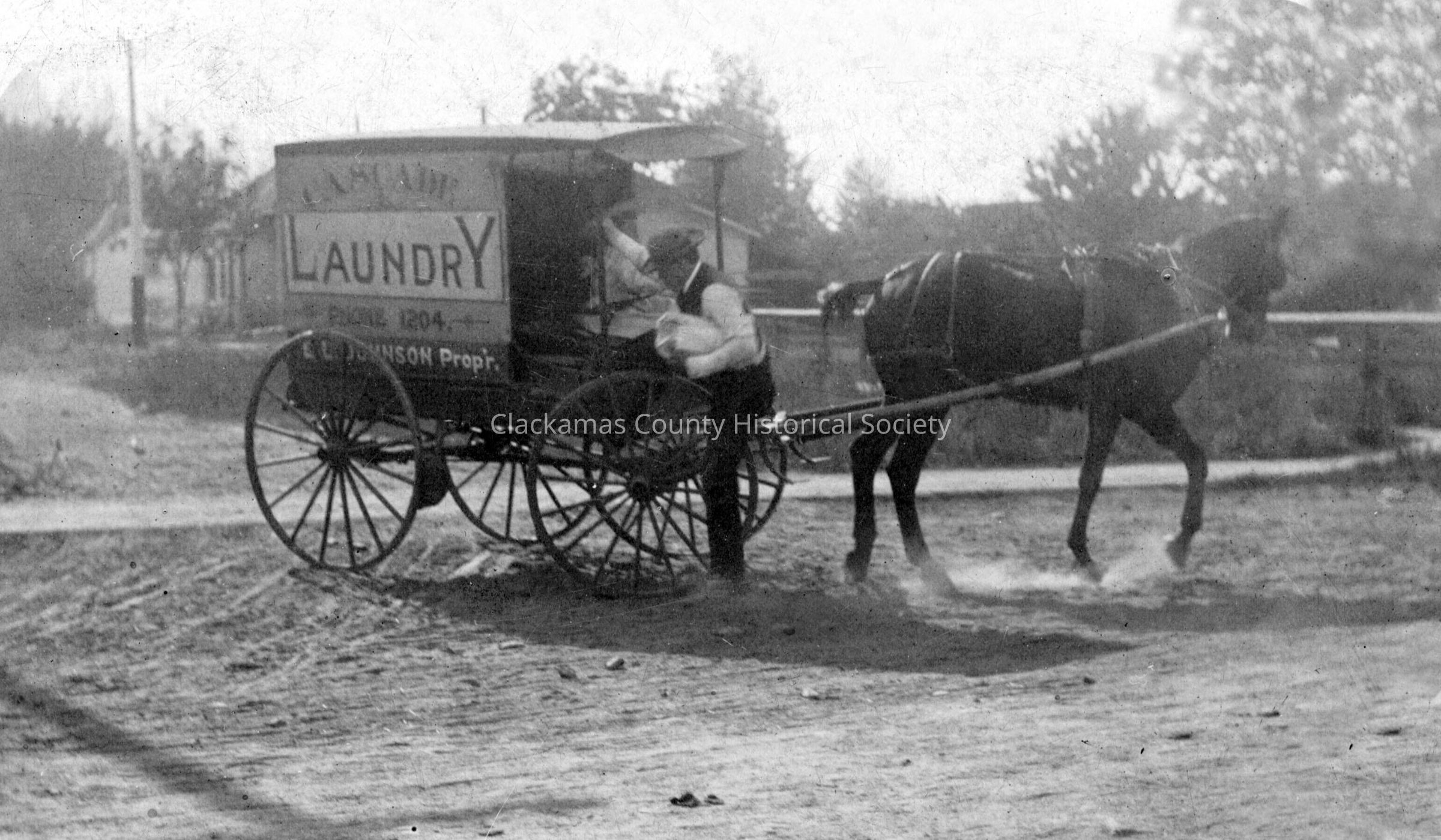 Ed Johnson with Cascade Laundry Wagon. Note on back of photo reads, "1st White Man Laundry." (in Oregon City)