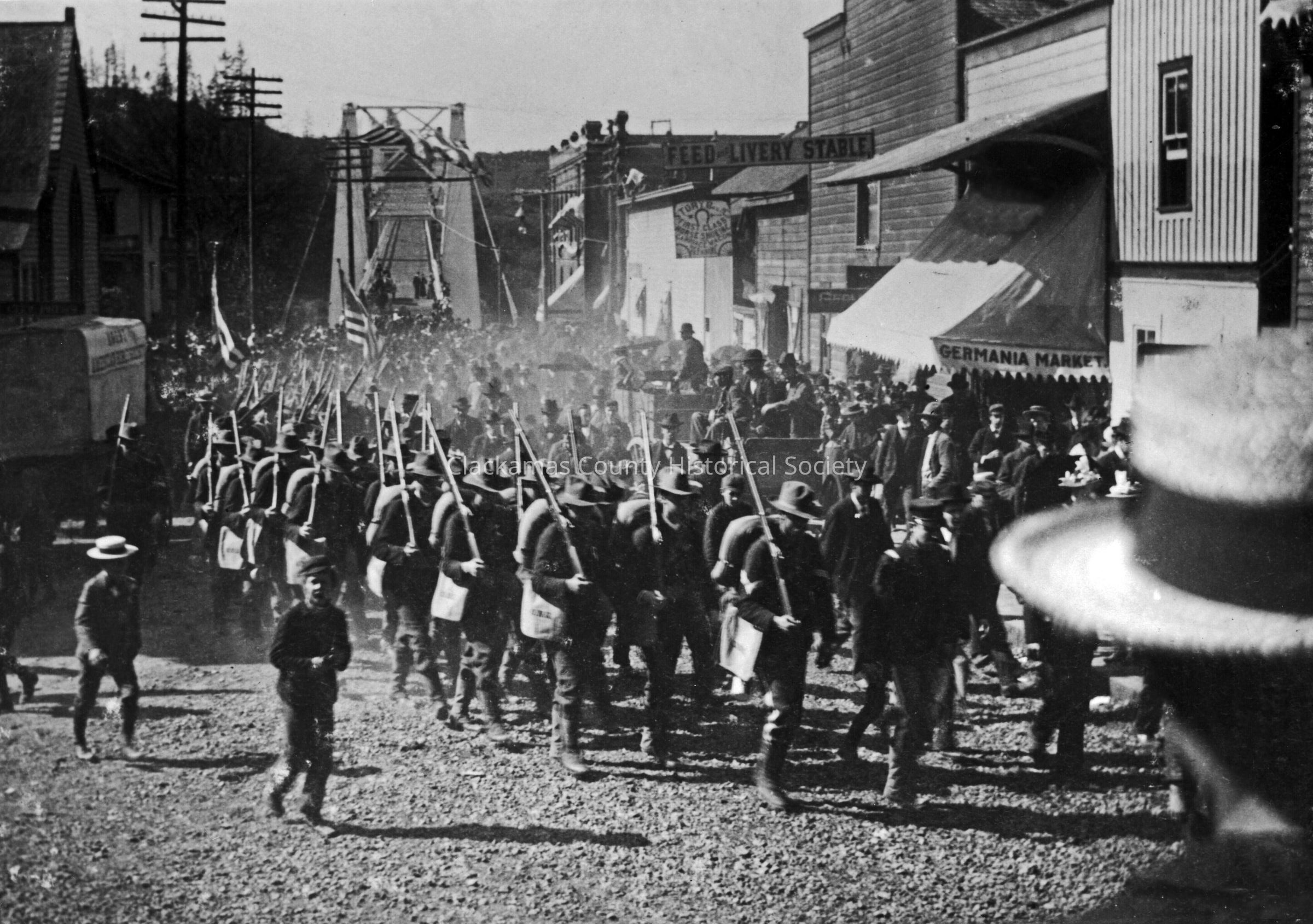 2nd Oregon Volunteers, Co I, 7th and Railroad, 1898. Off for Spanish American War. Going to San Francisco for training. Arch Bridge in background.Made/Created