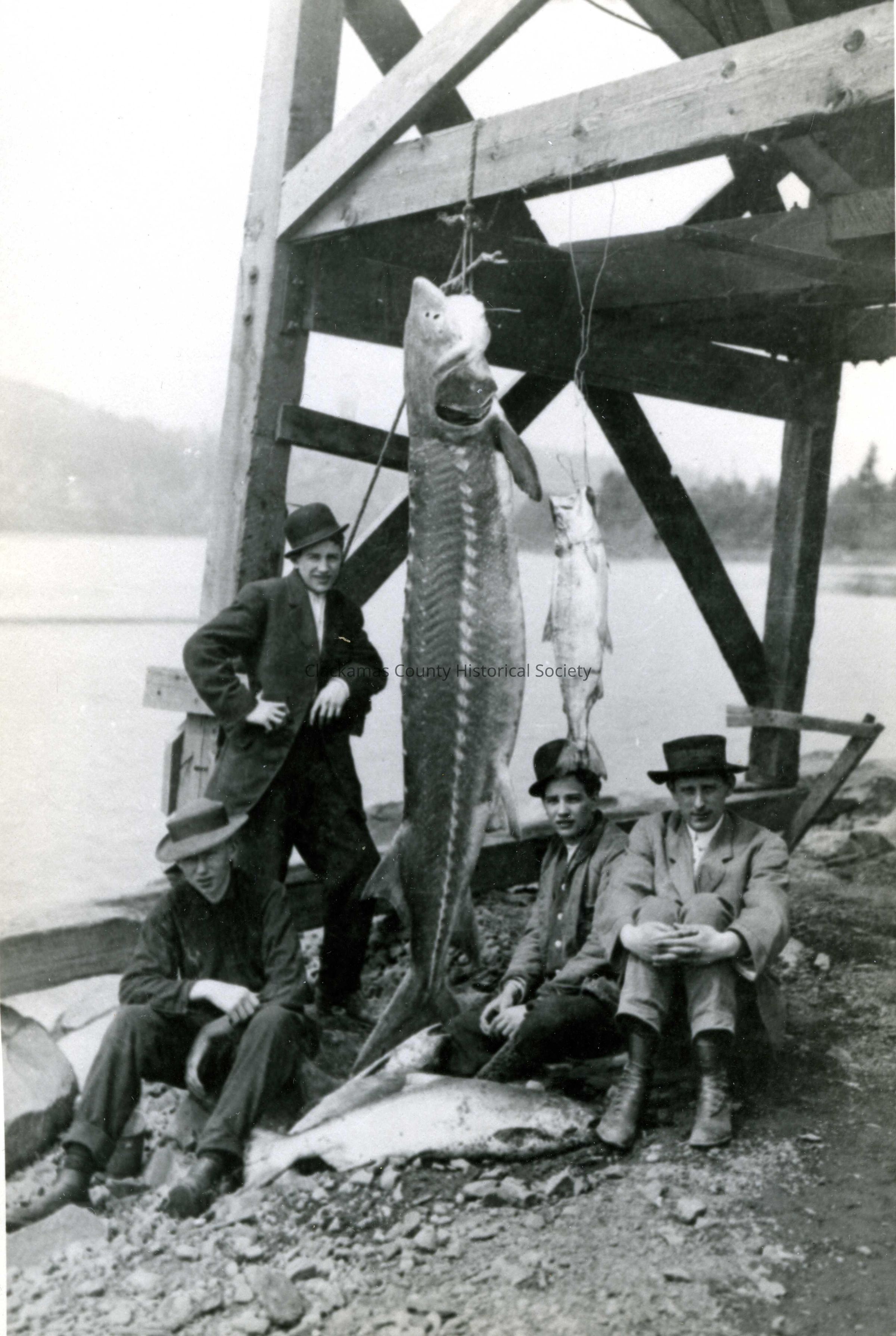 300 pount sturgeon caught in the Willamette River at Milwaukie. From left to right: 1) Ed Darnell; 2) Tom Lakin; 3) Chick Lakin; and 4) Jim Mathews.Made/Created