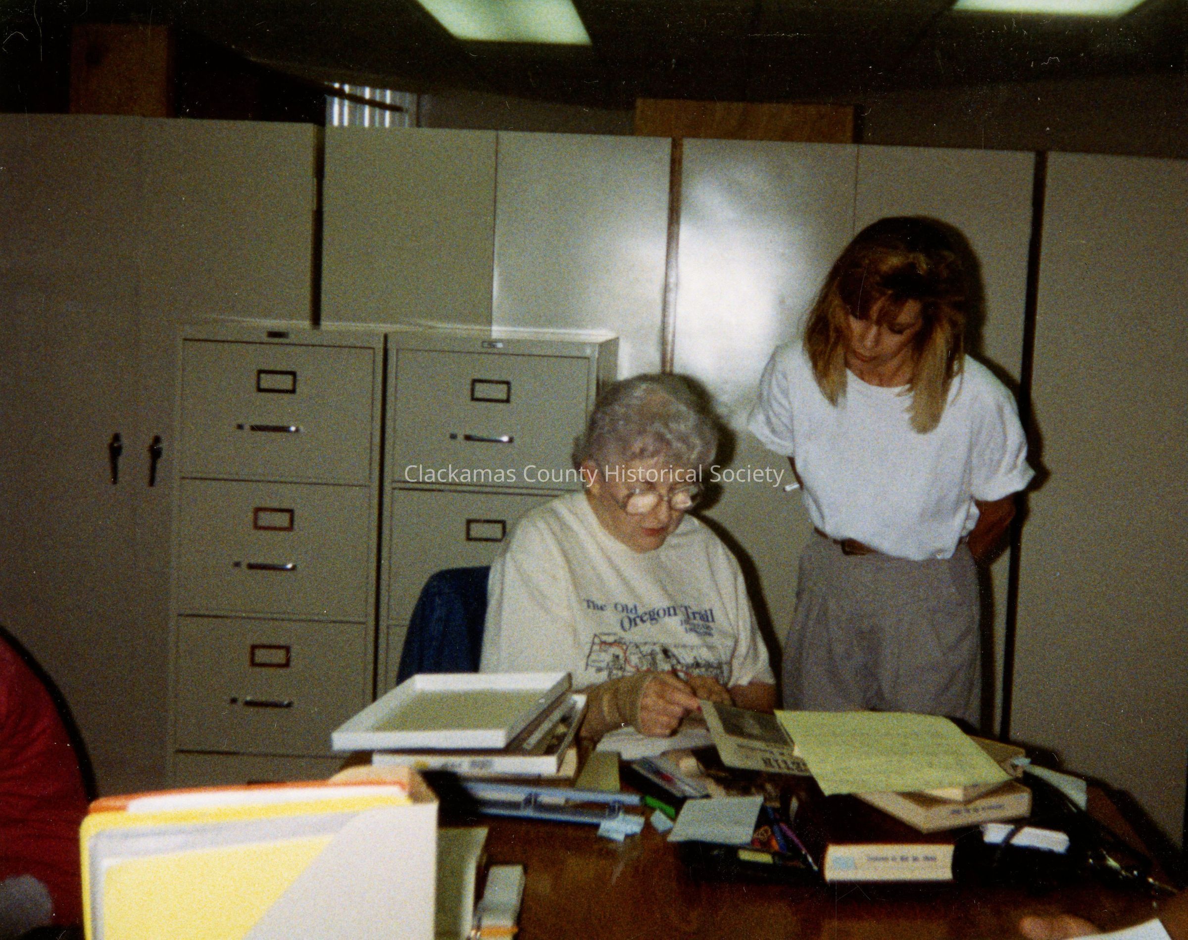 At Clackamas County Historical Society (CCHS) August 1993 CCFHS Volunteers - Sandy McGuire and Helen Burns of Maryland