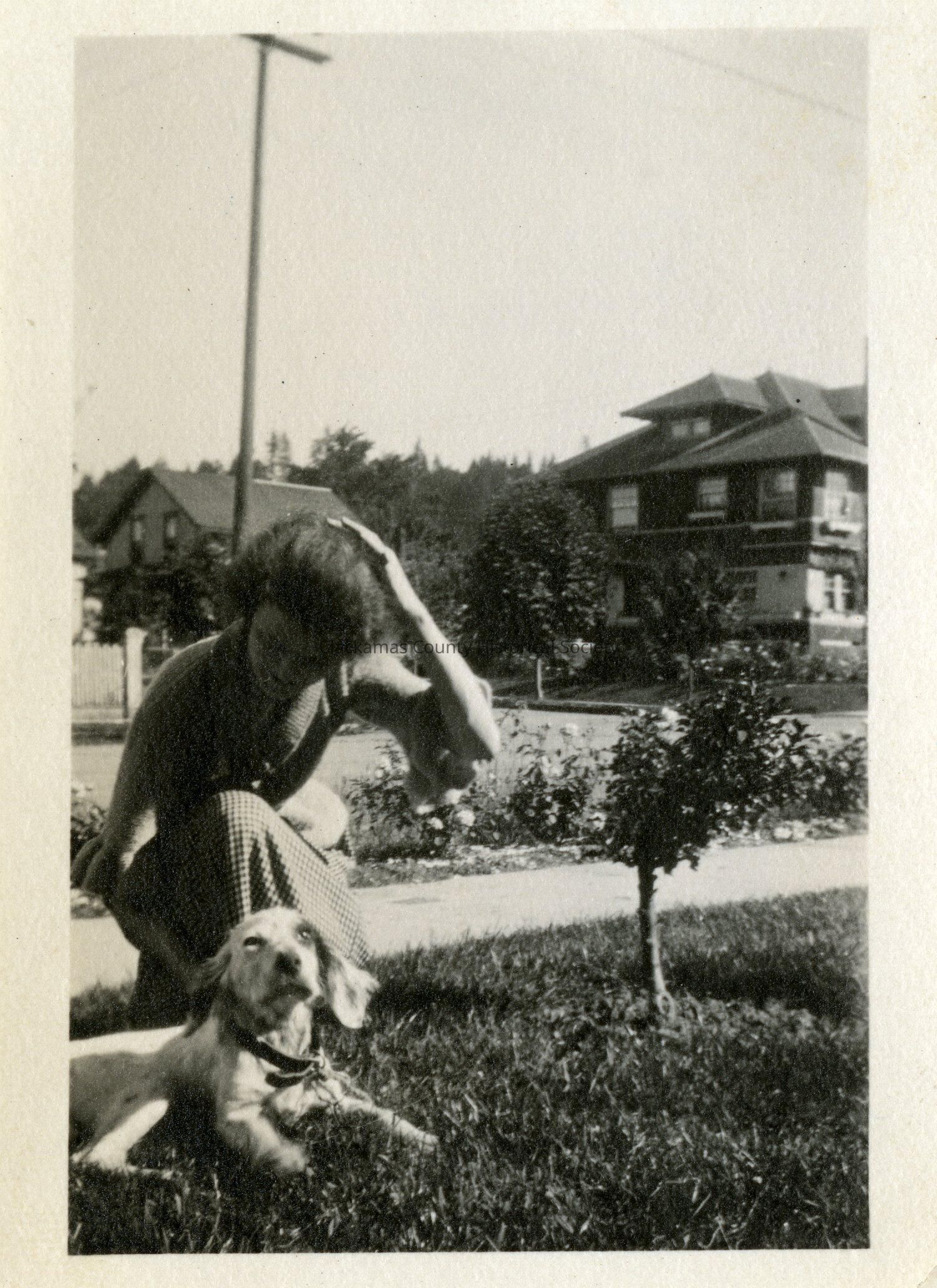 Ethel Miller with dog 6th and Center Sts., Petzold house in background