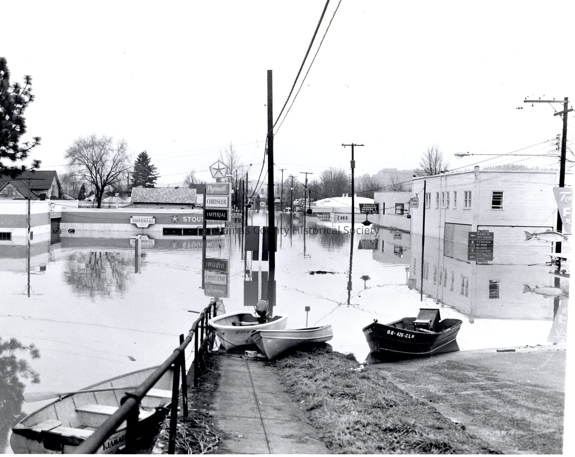 1964 flood. Stout's Motors. Oregon City. Motorboats and people. Flooded commercial area.Made/Created