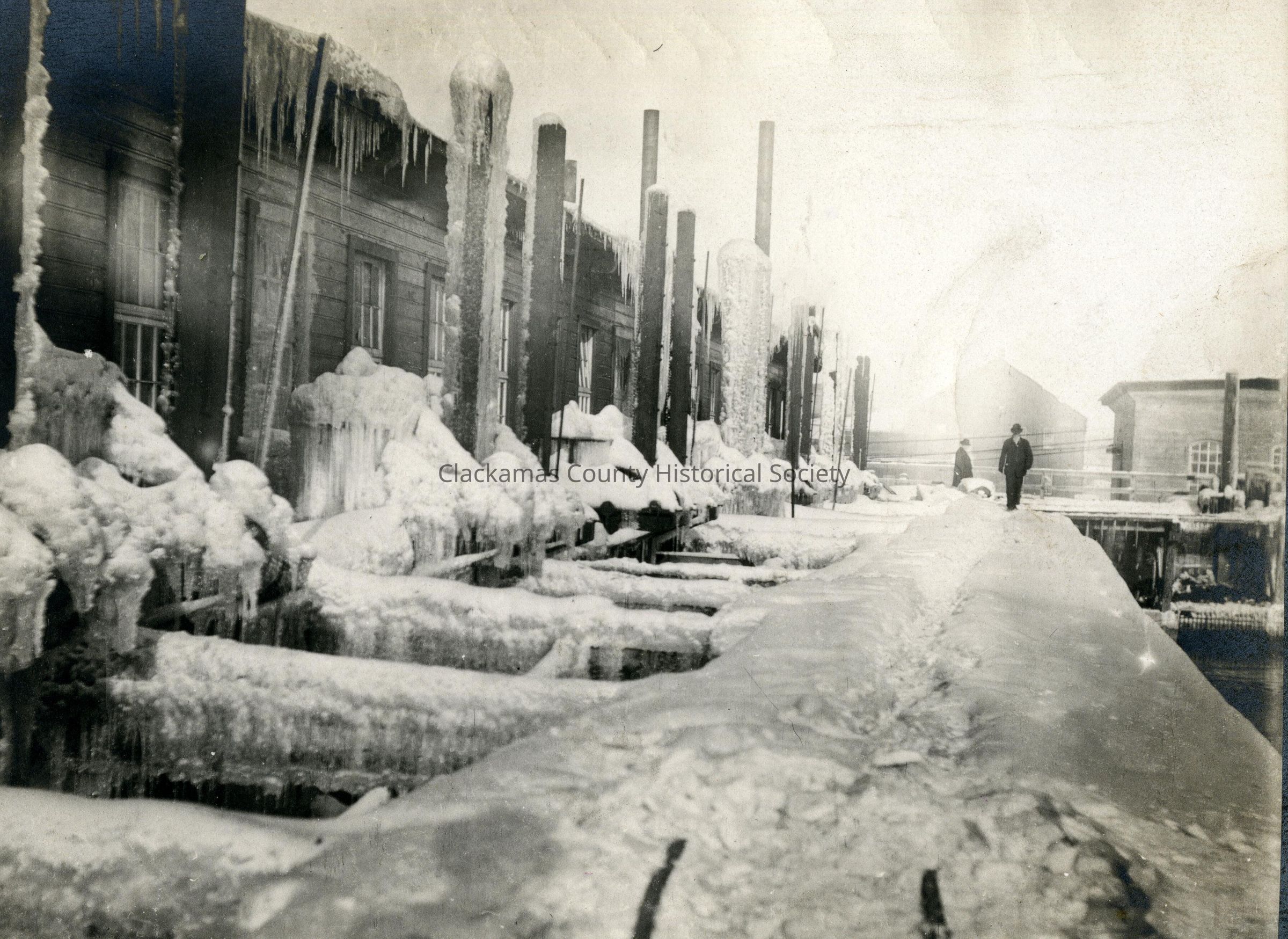 Photograph of the upper basin and Station "A" in winter of Ice and Snow. At the Willamette River Falls.