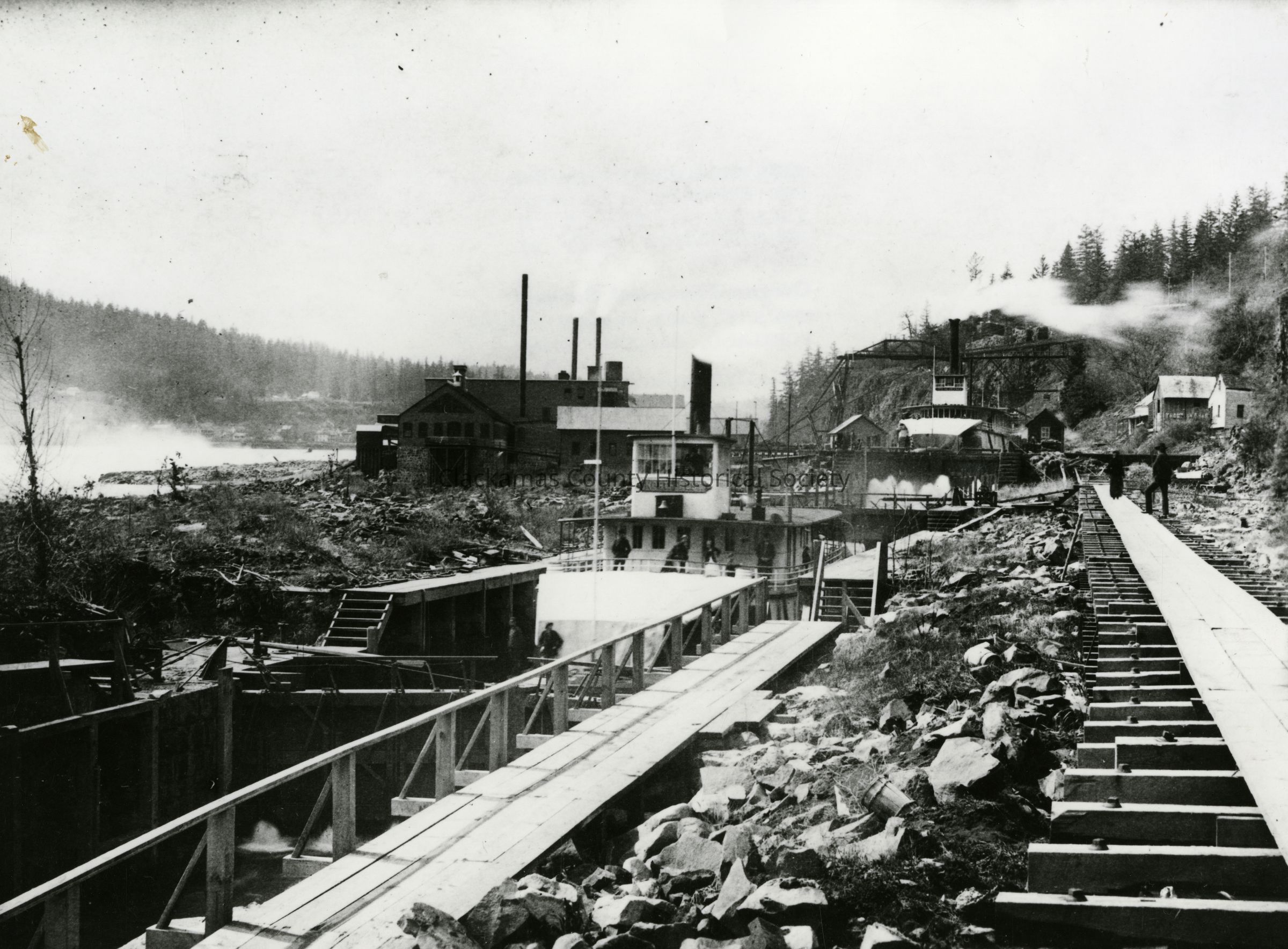 Tugboat "D.H.Bates" going through the Willamette river locks in West Linn/ Oregon City, Oregon. The West Linn Mills visible in background.Made/Created
