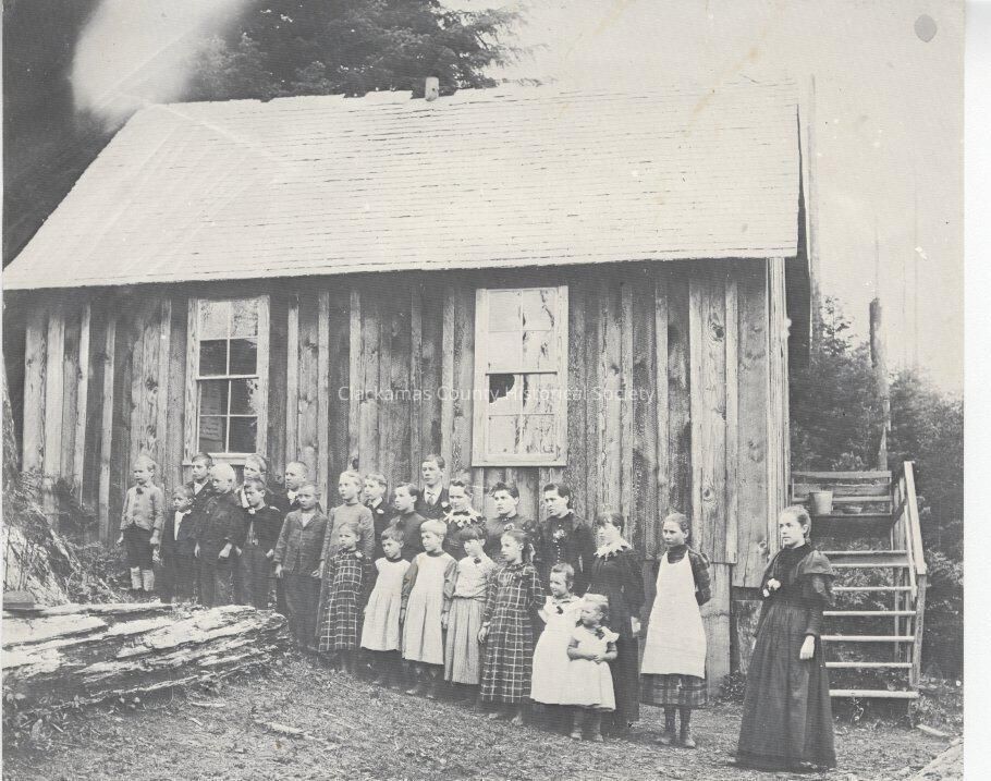 Cherry Ville School with unknown students lined up outside for picture. The unknown teacher is on the right in front of the steps to the building. At the top of the steps note the bucket and basin. The date of this picture is unknown.