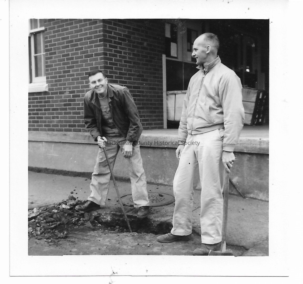 Photograph showing 2 men breaking ground. Presumably for the new post office. Man on left is unknown. Man on right appears to be Ronald E. Townley