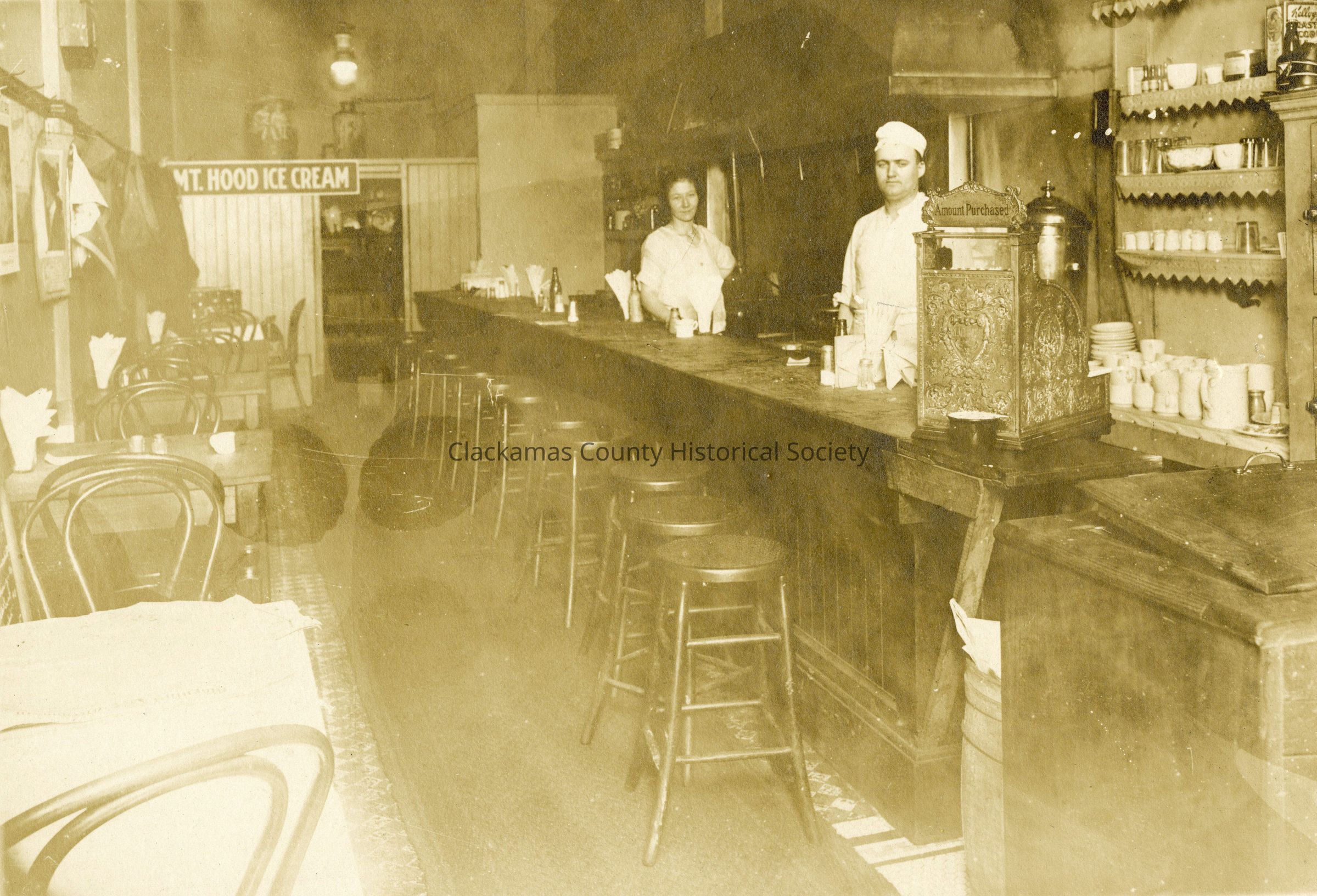 Interior of Unknown Soda Fountain/Cafe. Sign in Background - "Mt. Hood Ice Cream"