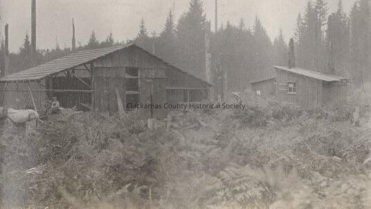 An old barn and other smaller structures are in the background. A horse-drawn wagon with two people is postioned in front of the barn.