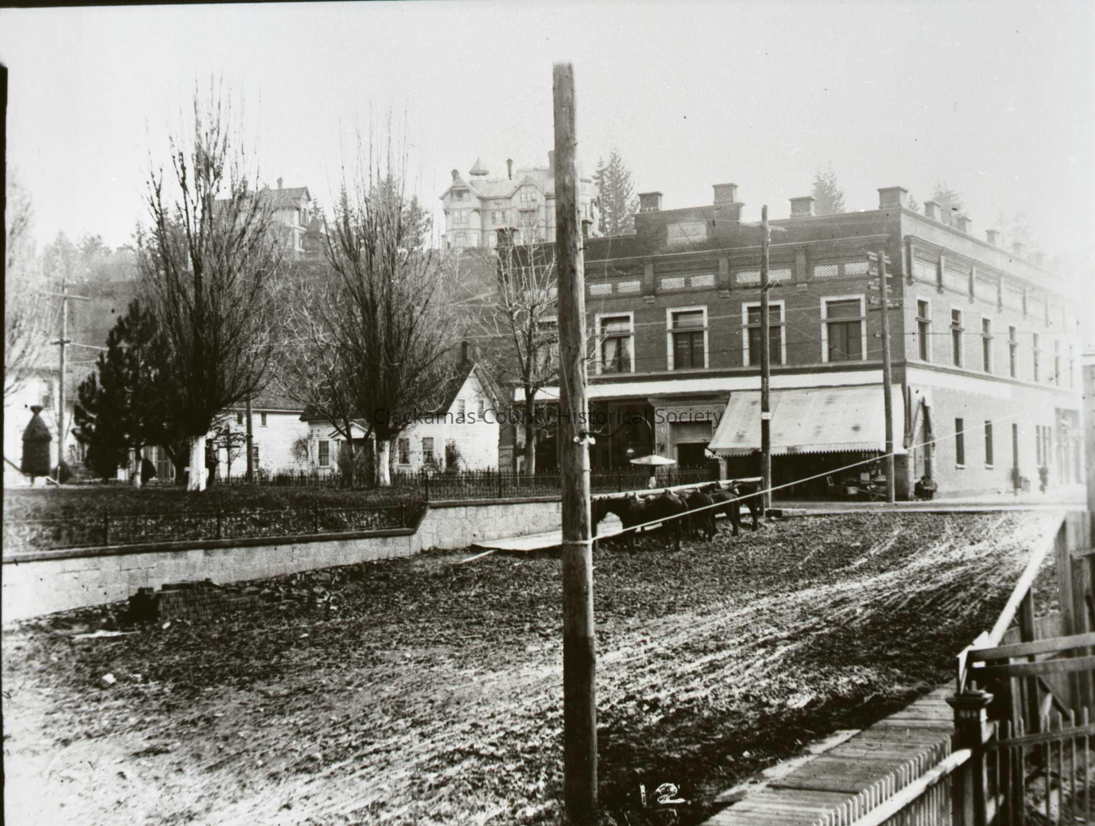 Oregon City 1896 - Hitching Rack on 8th Street toward the Weinhard Building on Main StreetEntry/Object ID
