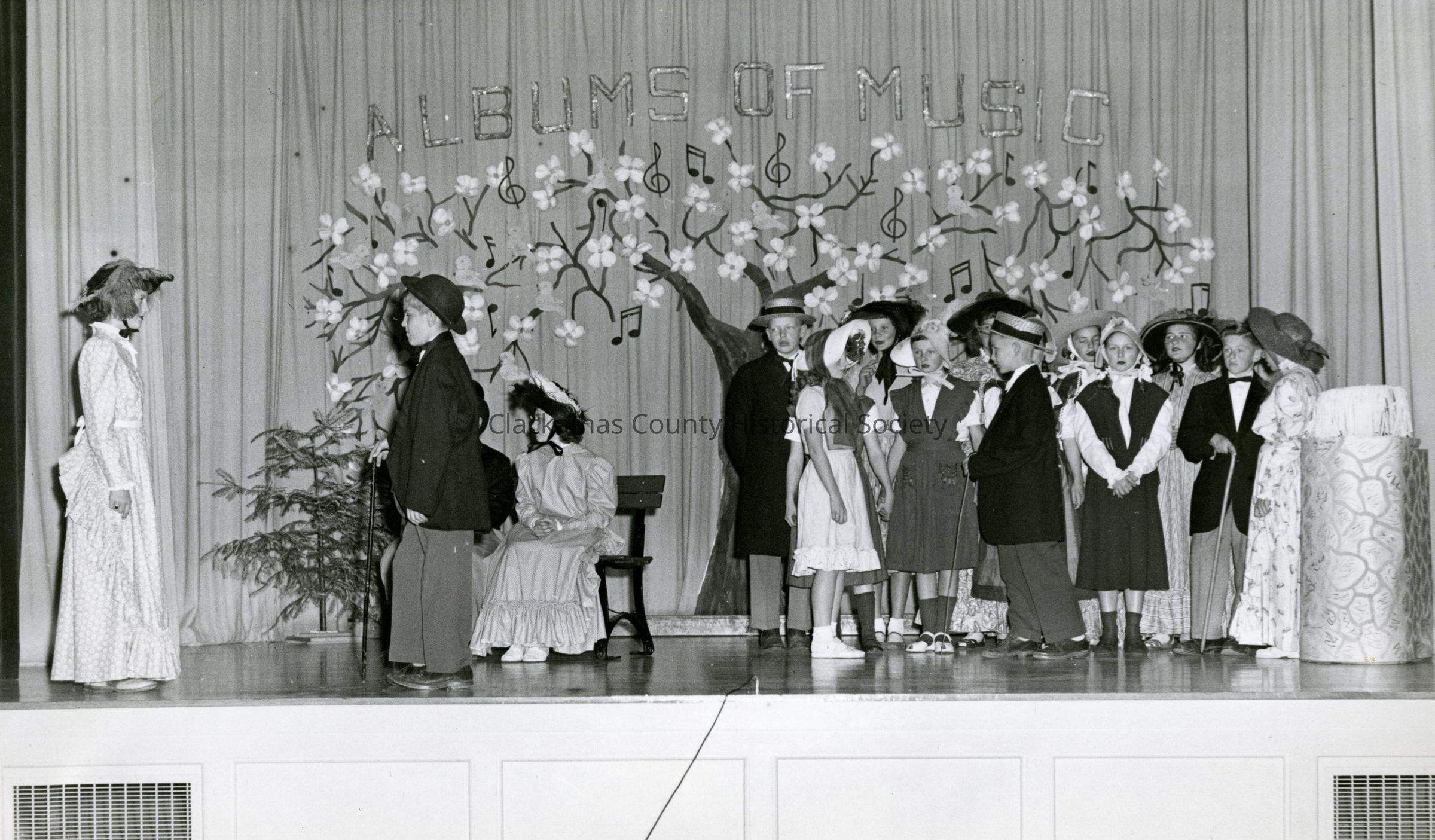Park Place School, Oregon City, Clackamas County, Oregon. An unknown class event of young people in period costumes on a stage. Signage says: "Album of Music". The date is unknown.