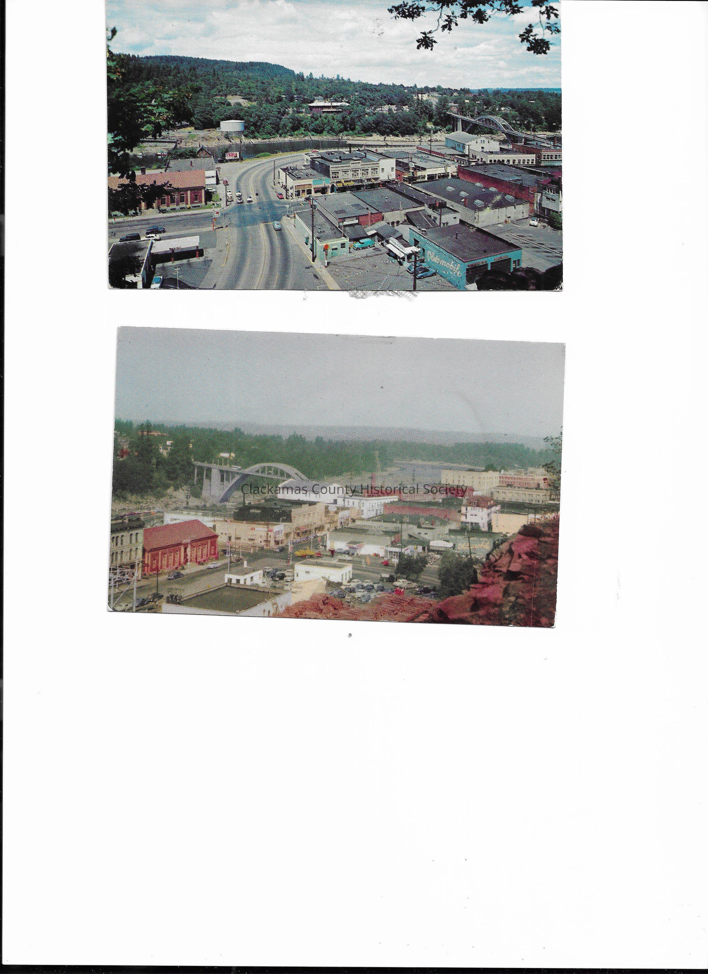 Two post cards showing the down town Oregon City buildings. Taken from the hill above the down town area. Back of both cards indicate that they were pasted to something at one time.
