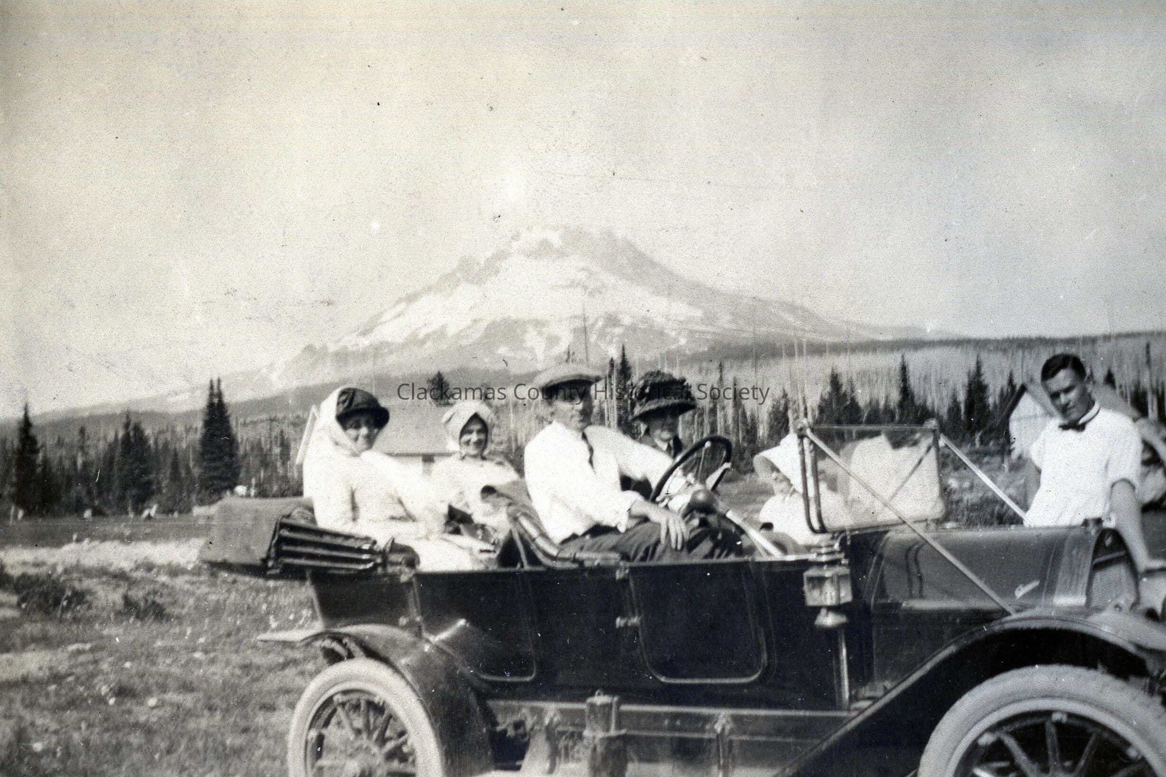 Mt. Hood Touring Car, 1915. Government Camp, Oregon. Open car filled with visitors and Mt. Hood visible in background.