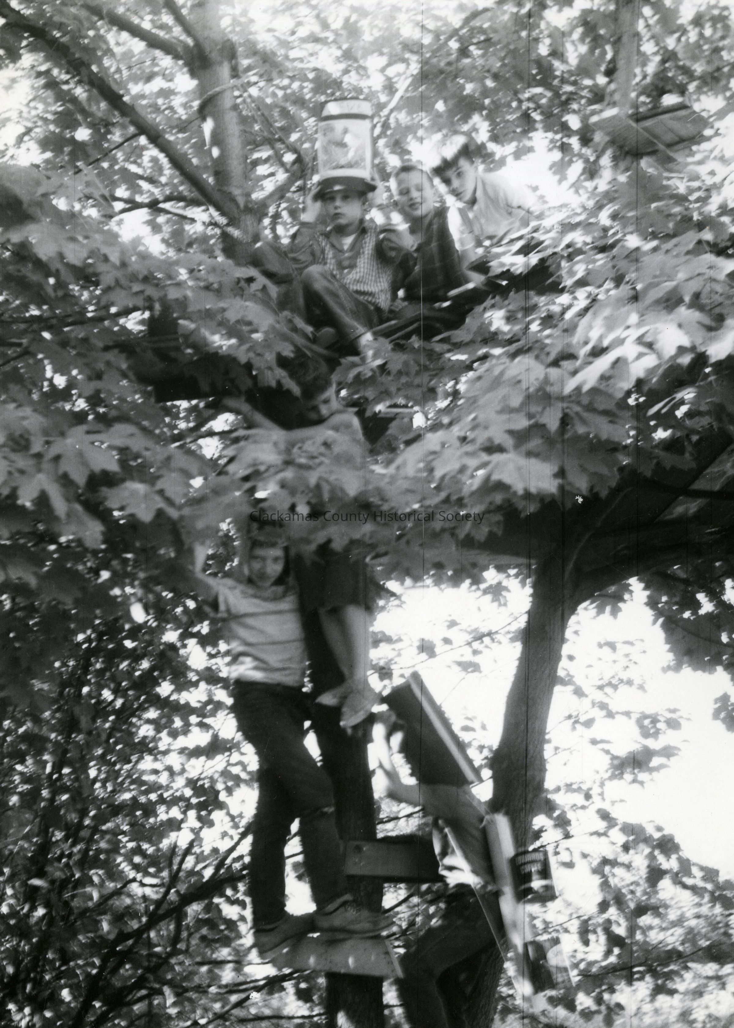 Kids playing in a tree house Oregon City Note on back - Tree house existed on city owned hillside for several years.