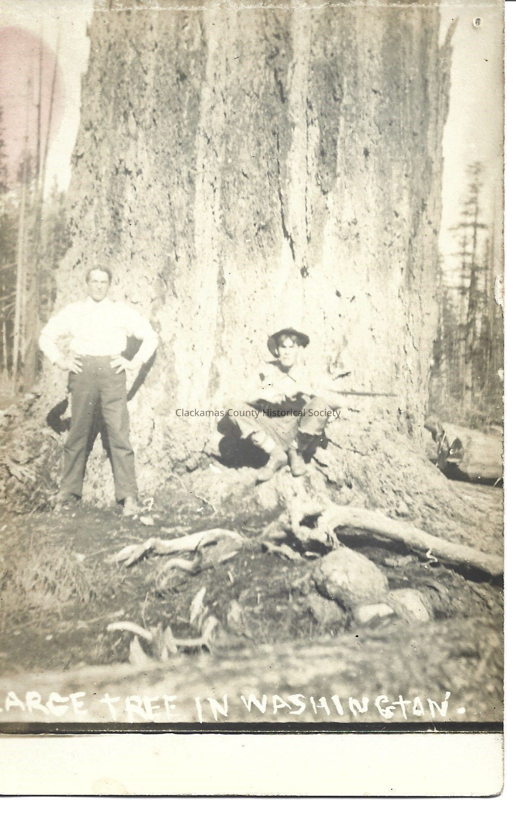 Photograph postcard. 2 men in front of a large tree. At bottom "Large tree in Washington" Postcard not sent. Unknown who the men are or precisely where the photograph was taken.