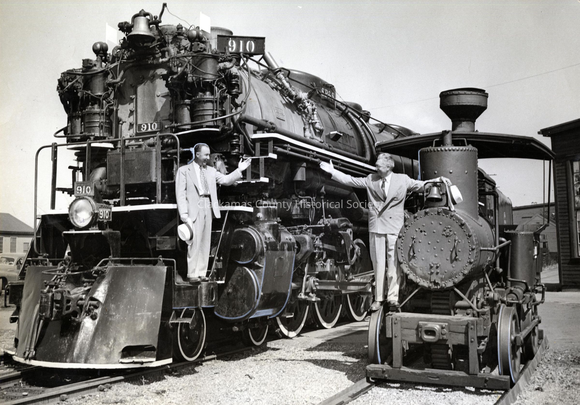On back of Photo - Now and Then - Oregon Pony - first locomotive to be used on Pacific Coast, contrasts with Spokane, Portland & Seattle Railway company engine in yards at Vancouver. Pony will be reconditioned for American Association for State and Local History convention, starting Monday. Omar C. Spencer (on Pony), president of Oregon Historical society, waves to E.B. Stanton, railway company vice president and general manager.