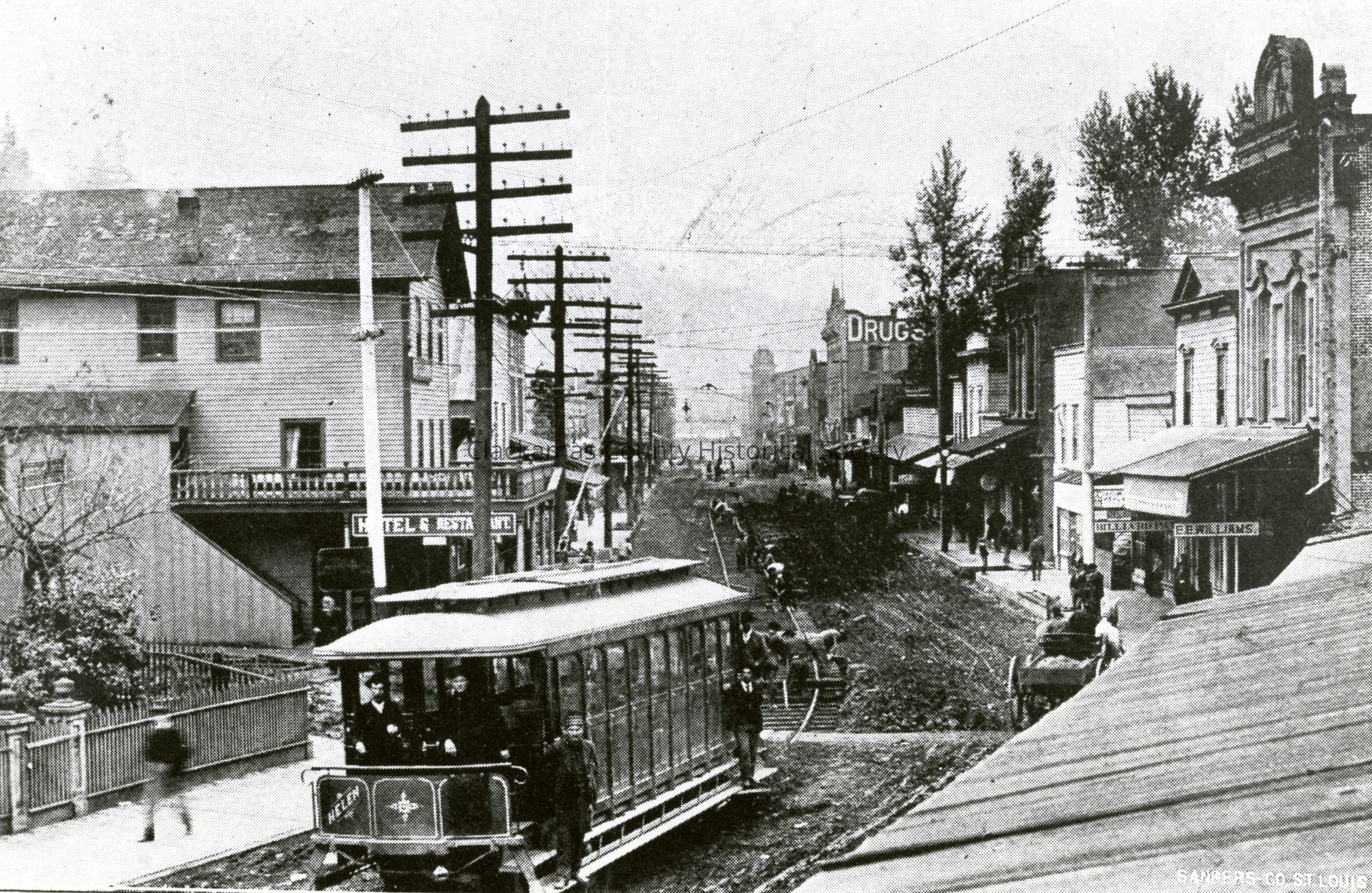 Helen; first street car to Oregon City 1893 6th and Main looking South Clackamas County