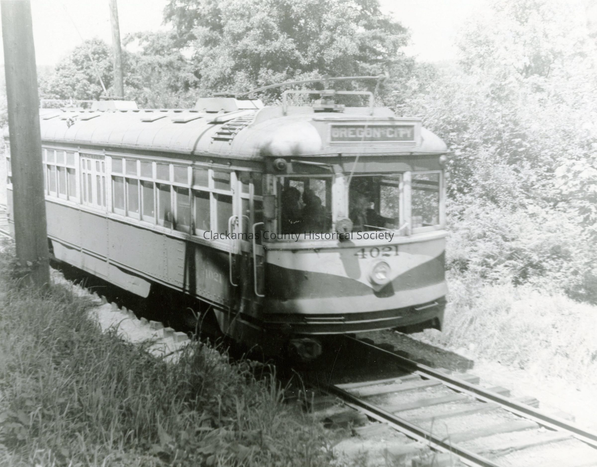 Oregon City Interurban trolley #4021 near Jennings Lodge, 1956 T-1400.000751