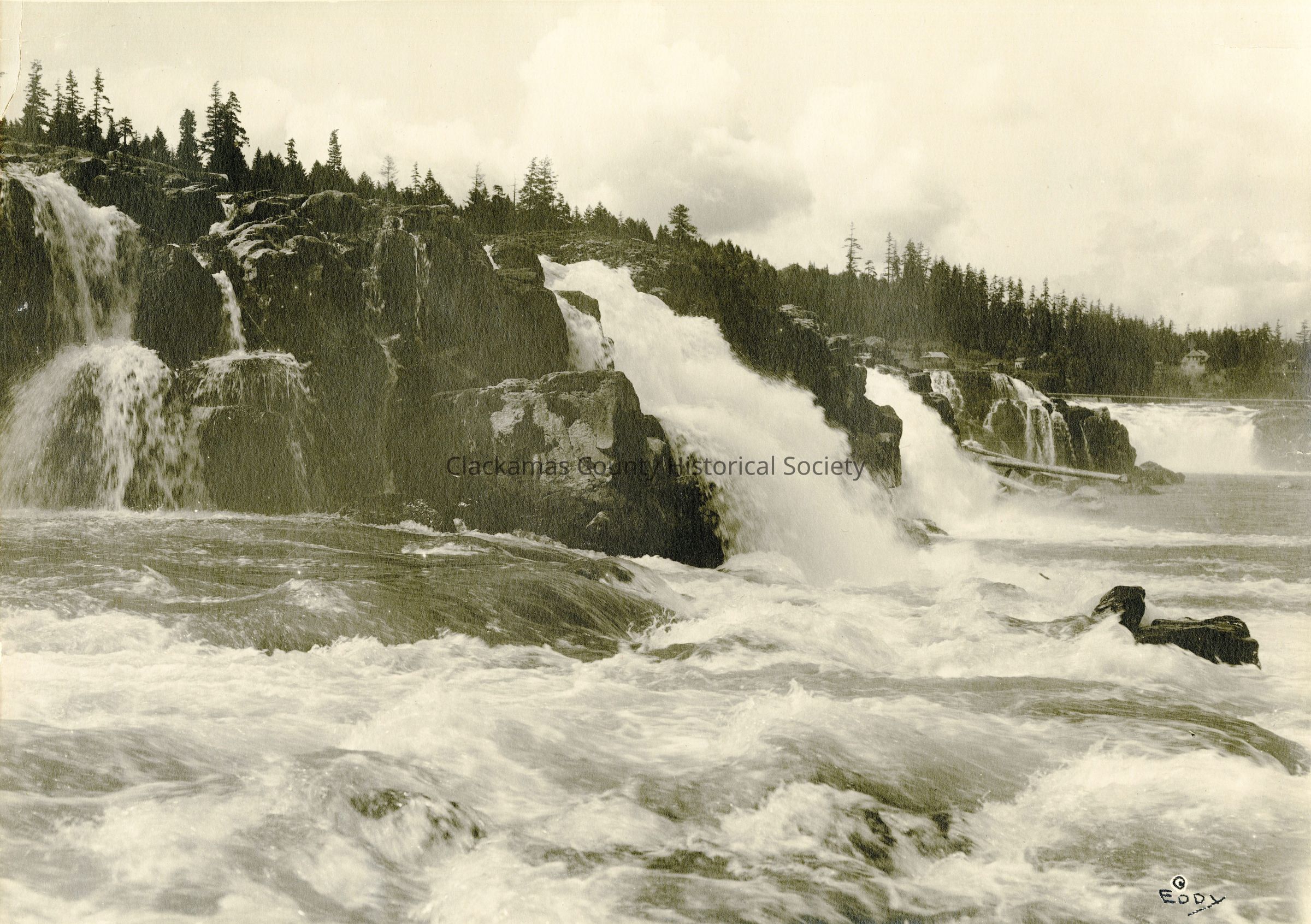 Willamette Falls before development. Note on back: The estate of Mrs. Bernice Ice - 11th at Center St., Oregon City. From an early pioneer family of Oregon City - The Helly's (Kelly's?)