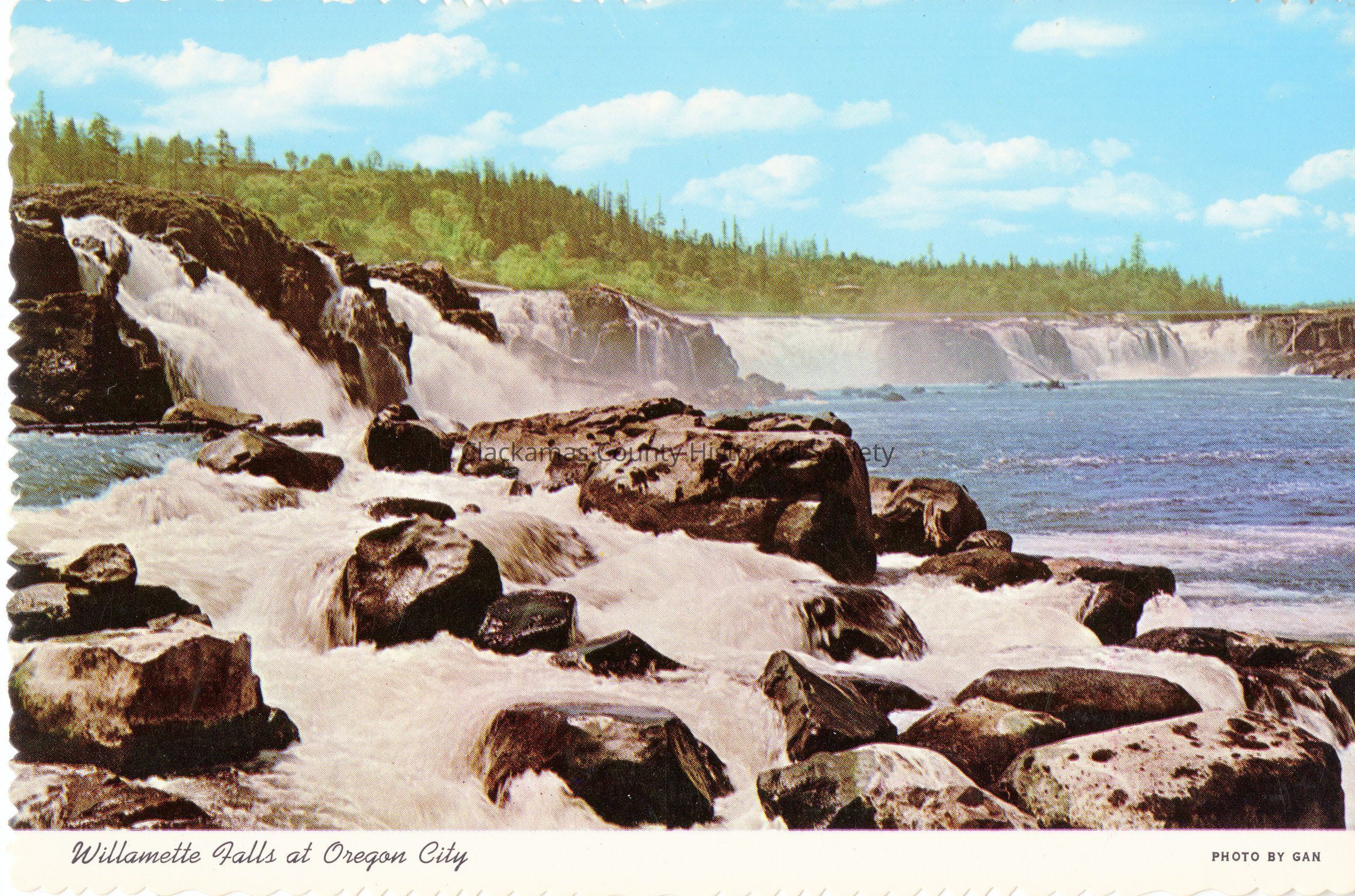 Willamette Falls. Postcard. On back: The Spectacular Willamette Falls, Oregon City, Oregon 3 copies. Assume this is colorization of older photo.