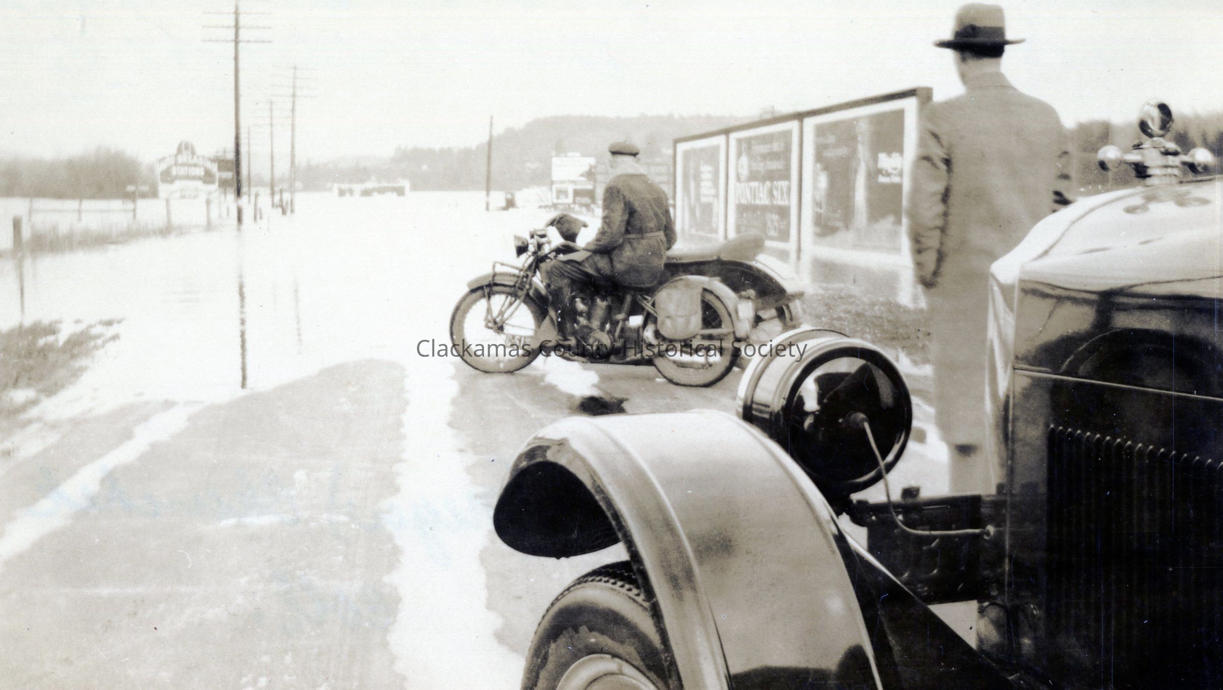 1922 Flood - Flooded roads, automobile and motorcycle travel, and travelers.