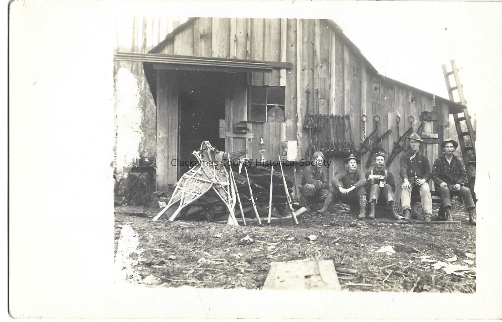 Photograph postcard - 4 men in front of cabin. Show shoes, rifles, fishing rods and trapping gear on and around cabin. 1 cent stamp. Looks to be same cabin as on accession #2024.007.007