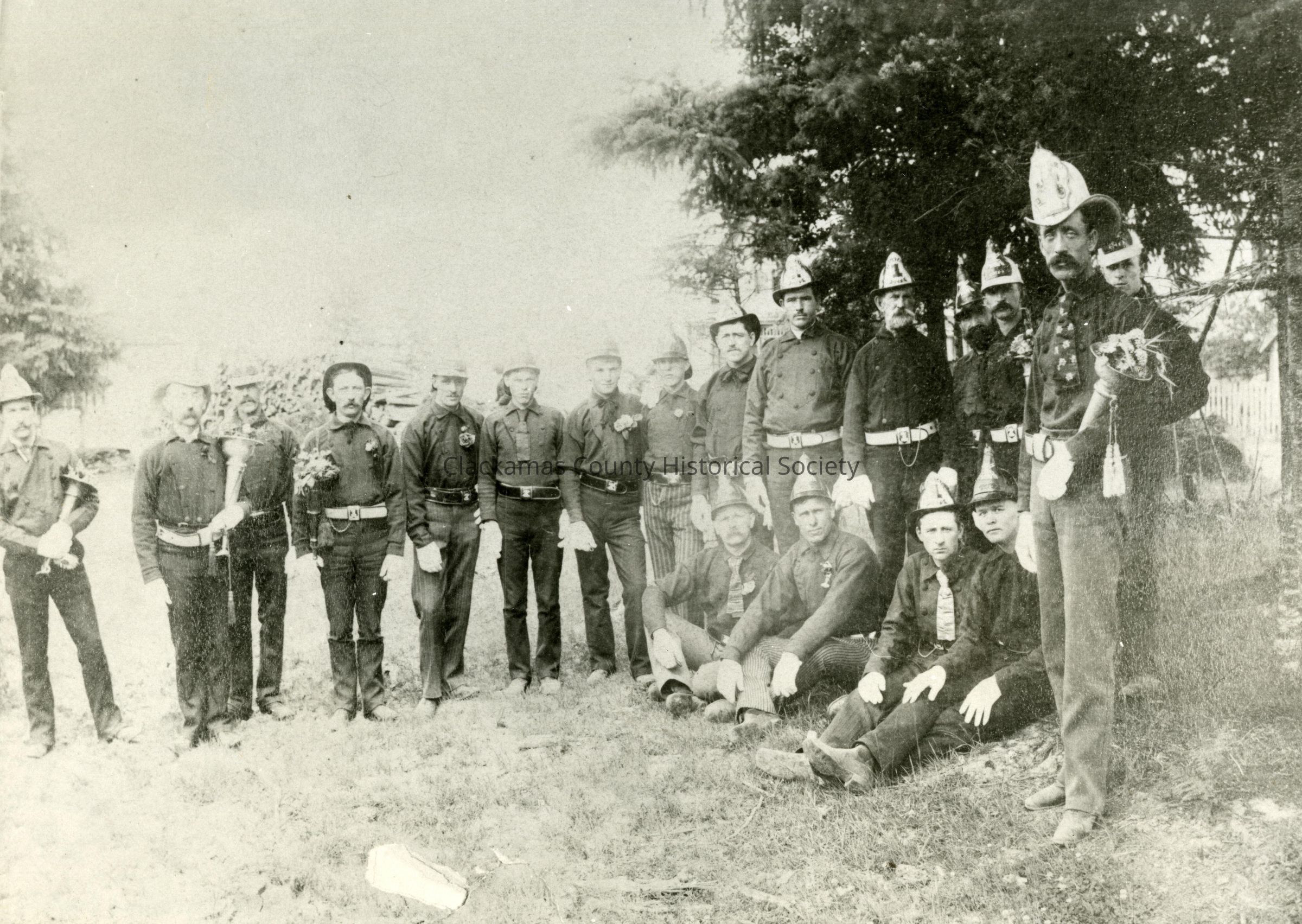 Oregon City Fire Department Fountain Hose Co., Oregon City at the Decoration Day ceremony at Mountain View Cemetery May 30, 1891. Left to right standing: Lawrence Hitchroth, assistant chief; Fire Chief Mike H. Flanagan, Fred Freese, William Dutcher, ... Spooner, next man unidentified, Charles Burns (some say Frank Turney), next unidentified, Captain Robert Young, William Dickelman, Bill Willis (some say Bob Blanchard), Edward Whitlock, Charles Bitzer, Bert Bacon, and in front, right, Peter Cragen, also once chief. Sitting left to right, Fred Metzner, unidentified, Frank Newton, and Henry Jones. Photo in the Molalla Bulletin Vol. III, Number 33 Wednesday, August 14, 1974. The photo was posted in the Oregon City Enterprise August 20, 1936 (JAH 01/2023)