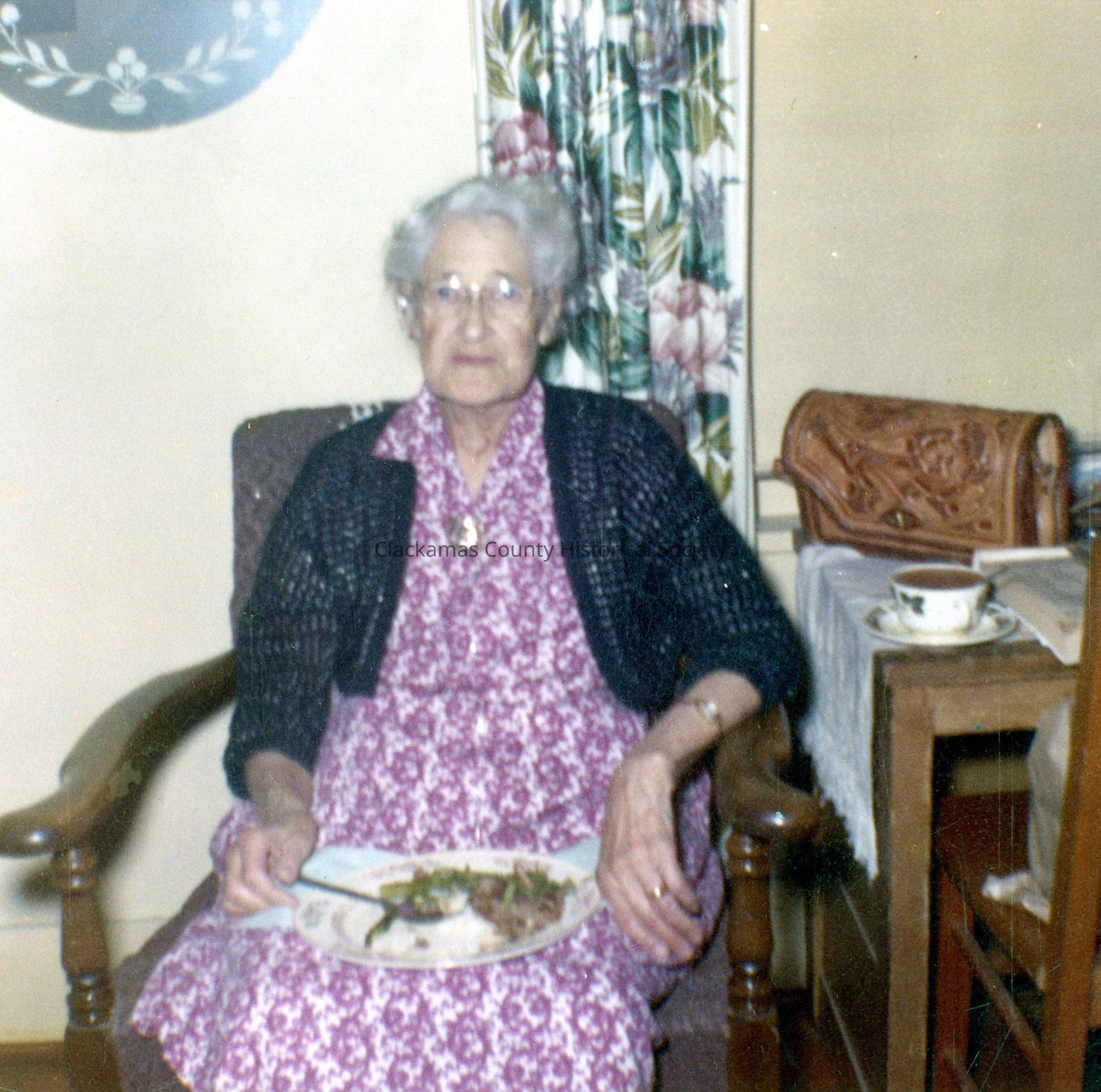 Grandma Lillian Cross - sitting in a chair having a meal with extended family after a group picture.