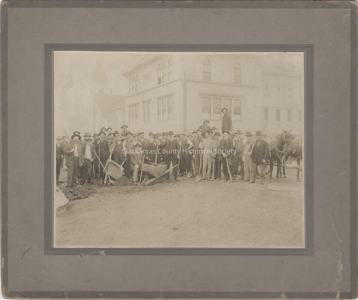 Street repair men working Oregon City Stevens Coll 1910 (1907?) 10th and main McLoughlin Institute in background