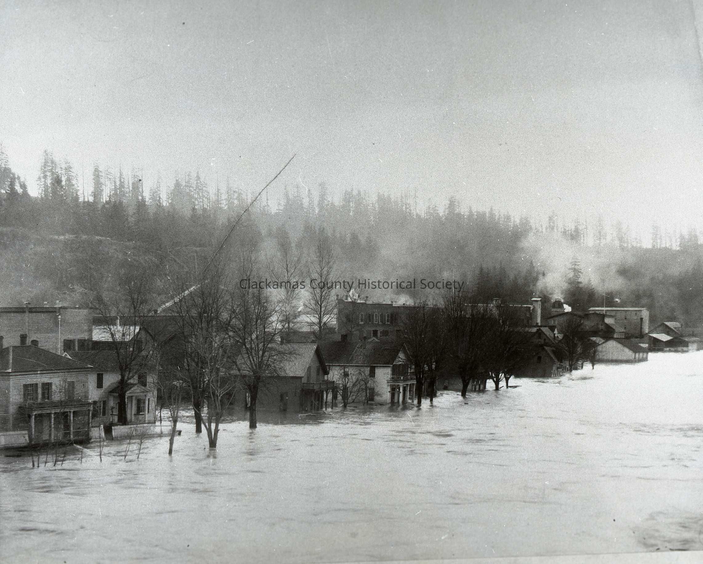 1890 Flood, View from the Bridge of 6th and Water Streets (now McLoughlin Boulevard), Oregon City. The Ermatinger House at 610 Water Street is at center/far left (JAH 12/2022).