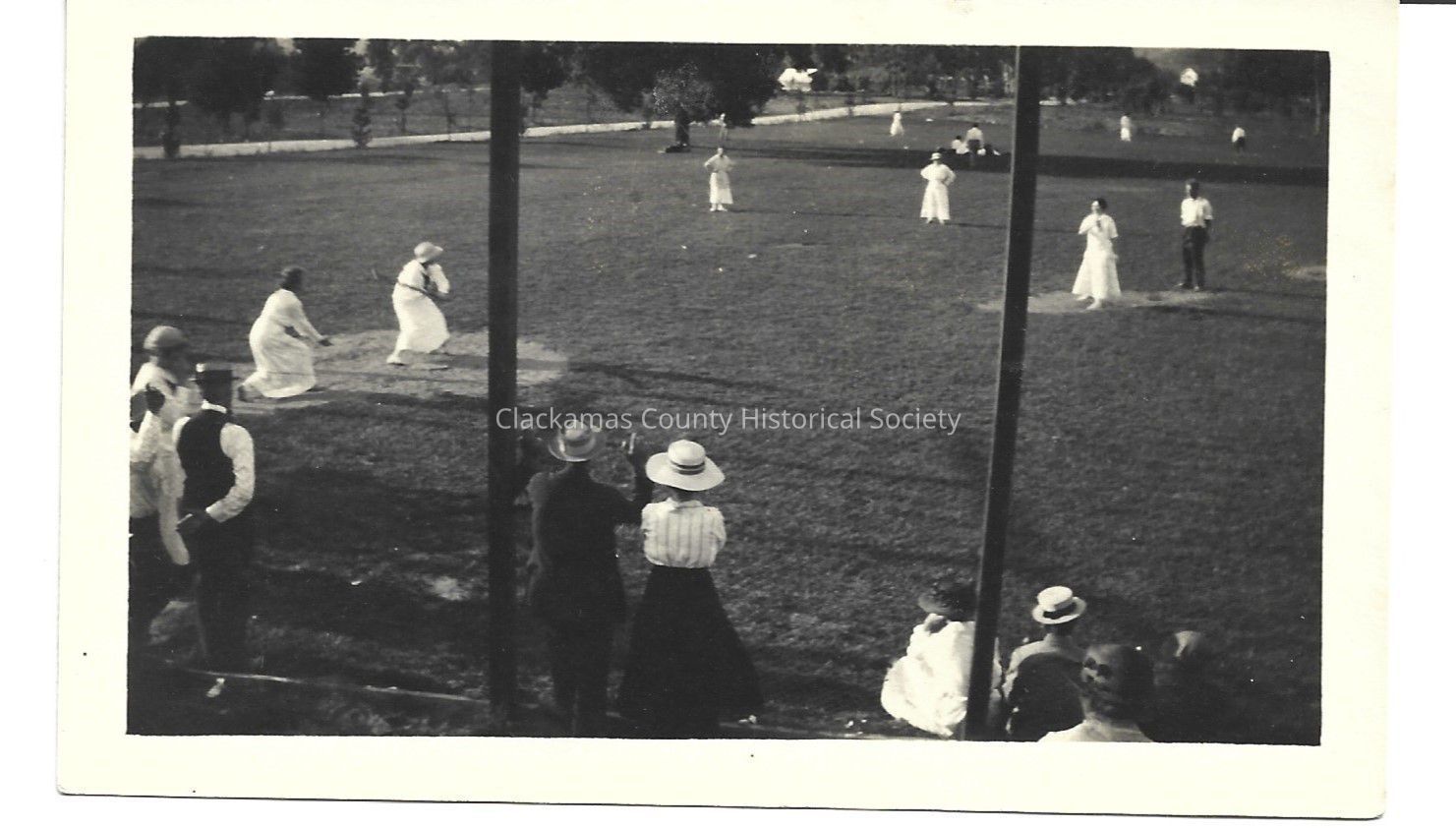 Photograph of women playing baseball. Undated. Unknown location. Based on long skirts and hats, estimate date to be late 1890s to mid 1910's. (Donor's ancestor, Gladys Calderwood was the right age to be one of the players. But that is actually unknown.)