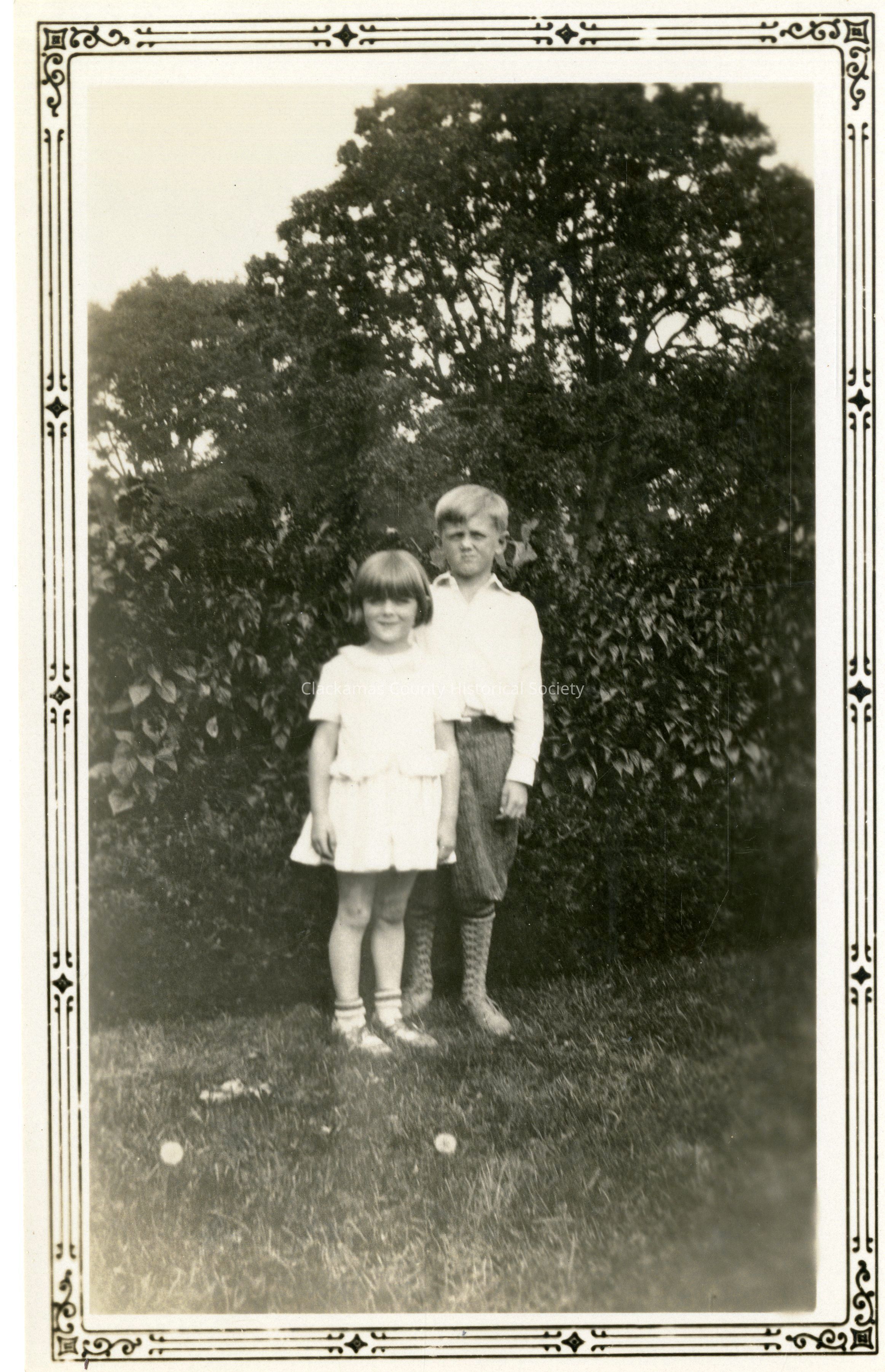 Laura (l) and John (r) Hoss, sister and brother, standing together outside in front of shubberyOther Names and Numbers