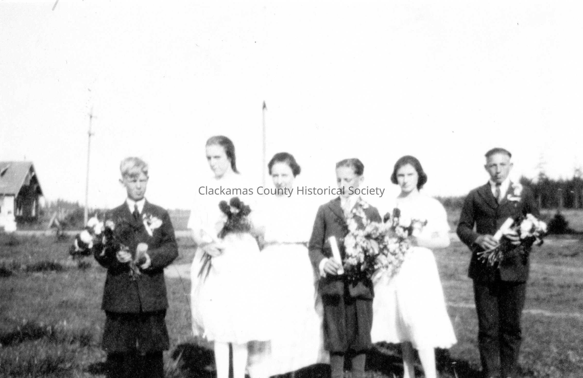 8th Grade Graduation, May 1922. L-R: 1) Lyle Hasselbrink; 2) Alise Bishop; 3) Mrs. Wood; 4) Edwin Riddler; 5) Camille Slater; and 6) ? Failmitzger.Made/Created