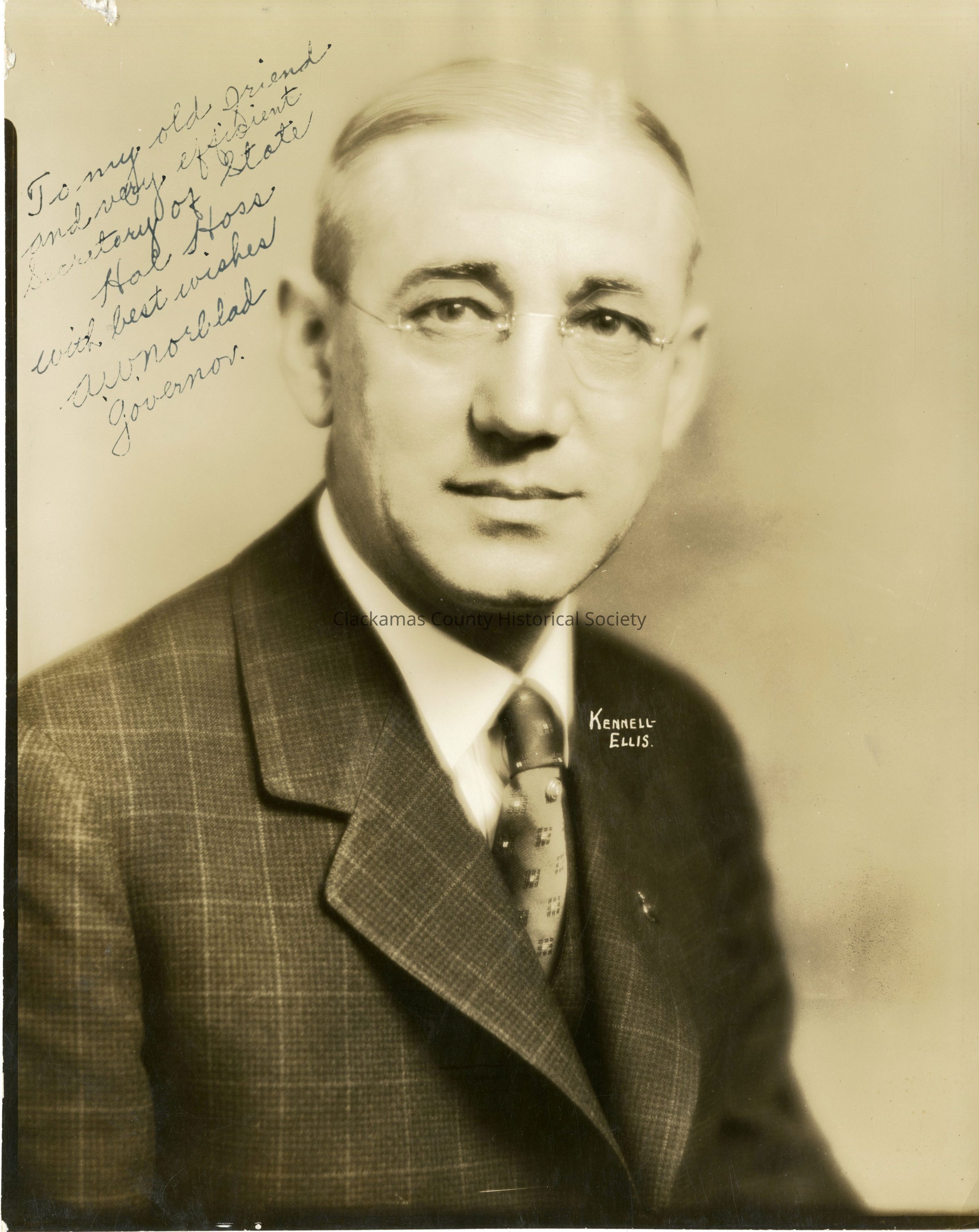 Studio photograph of Albin Walter Norblad Sr. - 19th Governor of Oregon. Personalized photograph given to Hal E. Hoss Oregon Secretary of State.Inscription/Signature/Marks