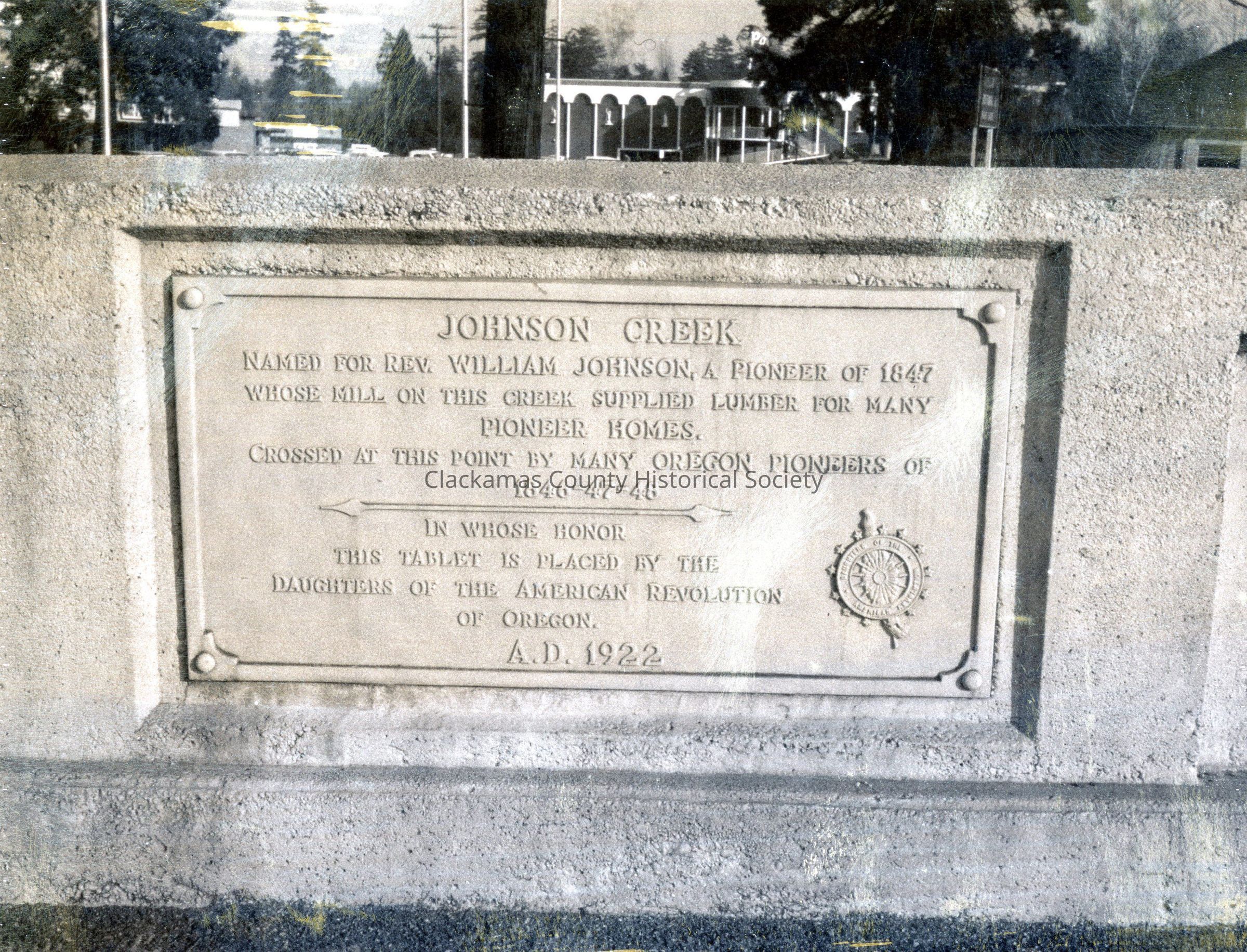 Dedication Marker on Bridge over Johnson Creek in Milwaukie, Oregon. Honoring Rev. William Johnson Whose mill on this creek supplied lumber for many Pioneer homes.
