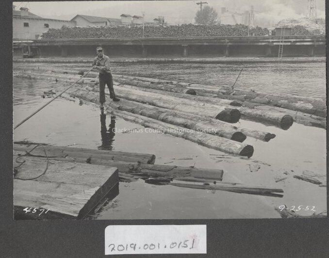 Photograph of man walking on logs in the water pushing them - dated 1952. 4571