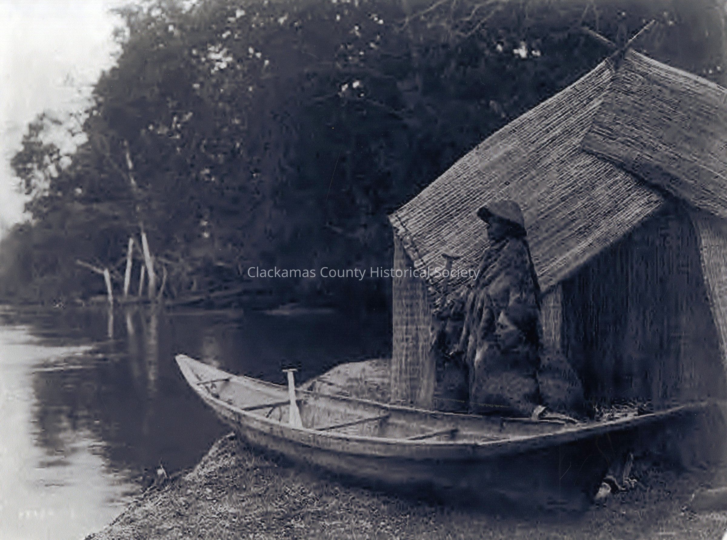 "A photograph from about 1913 shows a man and woman of the Skokomish tribe at a summer fishing camp. Their riverside shelter is covered with woven reed mats. The photograph was taken by Edward S. Curtis."