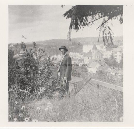 A man standing on the bluff over looking Oregon City July 4th 1913 Cross Coll
