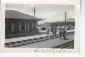 Men by a railroad station Fort Lewis Rissberger Coll P-1025.000171